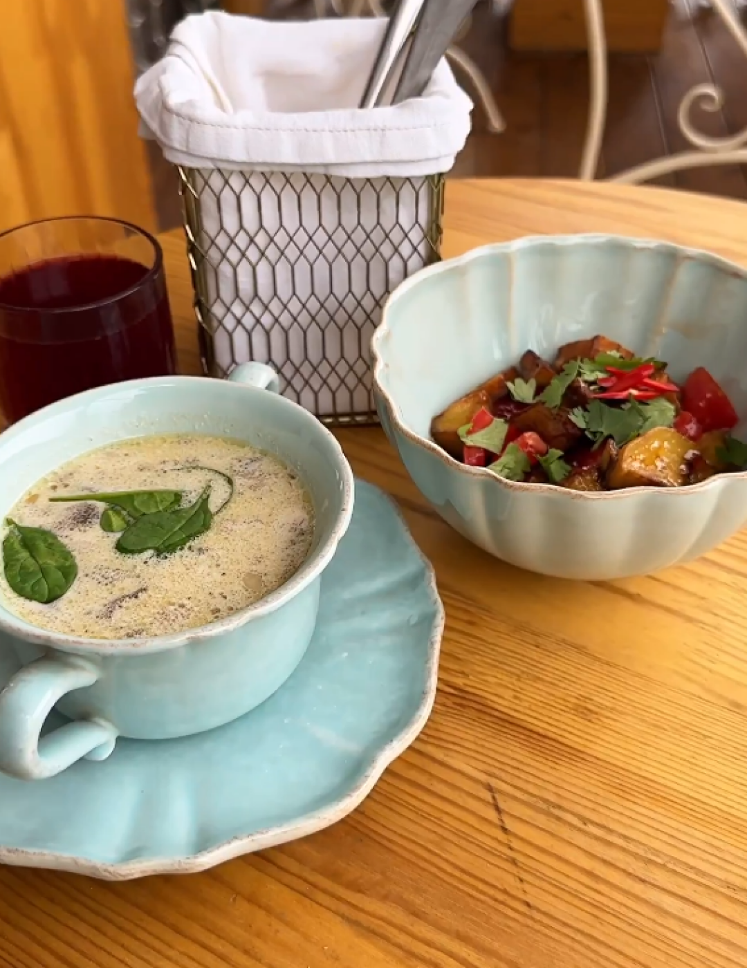 В меню ланчей вернули салат с баклажанами и телячьи щечки, а еще добавили несколько новых позиций: сливочный суп с морепродуктами, закуску из сельди с картофелем и черным хлебом, десерты и блины со сгущенкой.