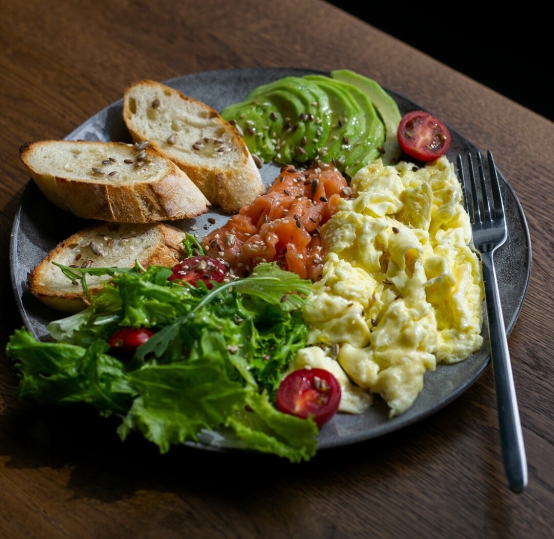 В кофейне теперь подают несколько новых завтраков: скрэмбл на сливочном масле с лососем, а еще можно выбрать скрэмбл с креветками, беконом или копченой курицей. В меню появились две брускетты – с яйцом пашот или с сезонными томатами. А из сладкого здесь подают сырники с мороженым и овсянку с ягодами.