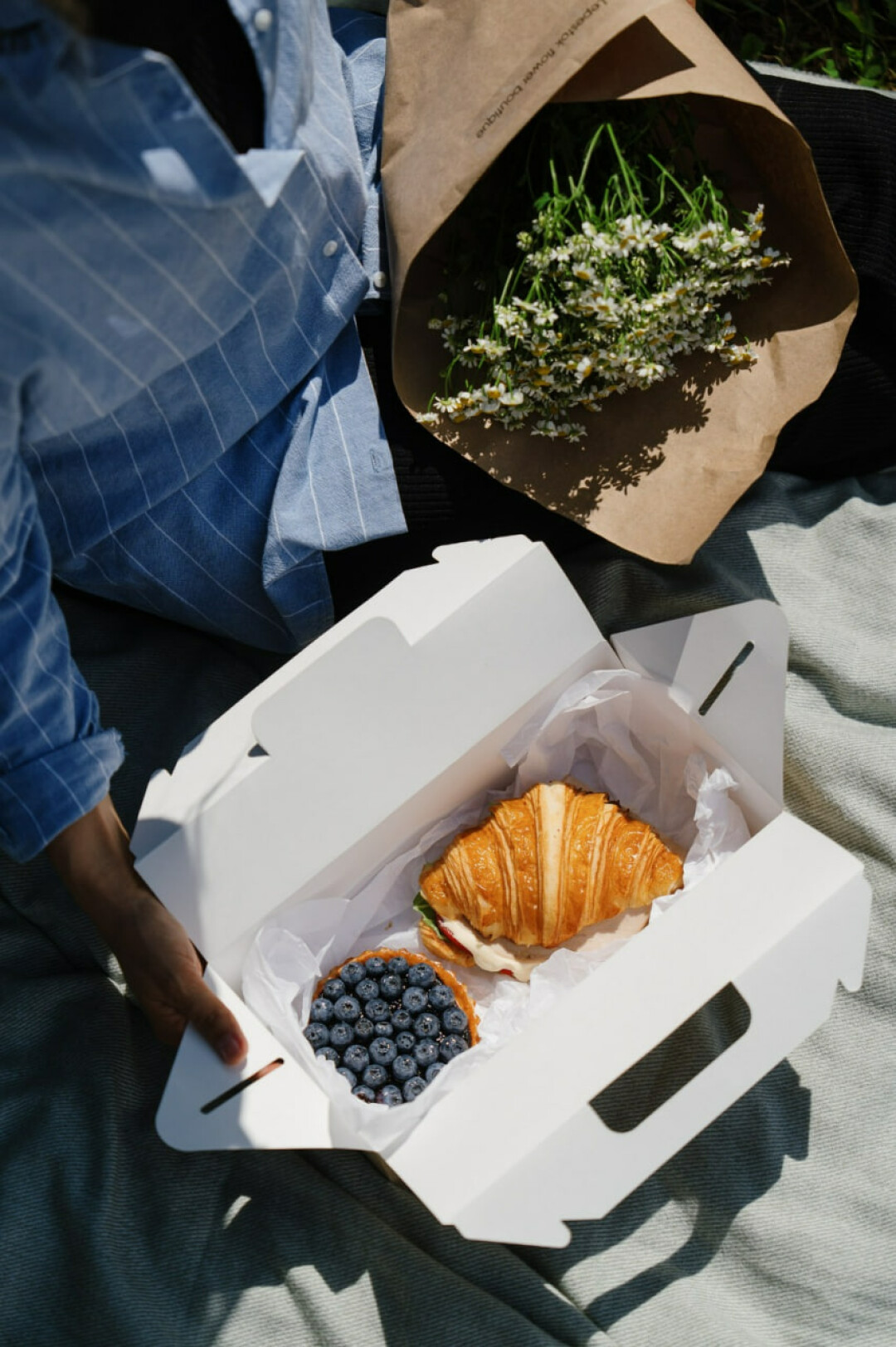 Специально для эстетик-ланчей в стиле Pinterest команда заведения сделала боксы, которые удобно брать с собой на пикник: внутри — круассан с курицей или ветчиной и десерт на выбор (тарталетка с голубикой, исфахан и набор из трех макарон).