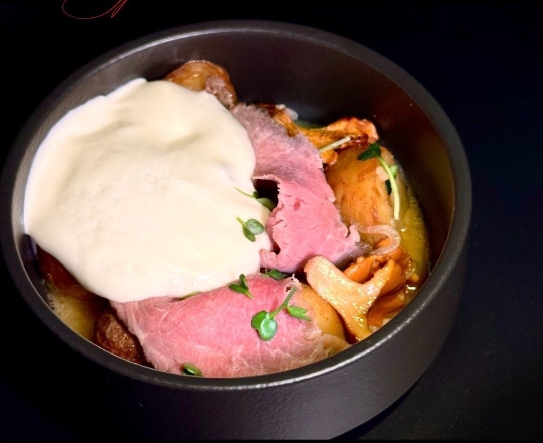 Здесь тоже запустили специальное меню к сезону лисичек. С грибами здесь подают тартар из говядины с трюфельным айоли, говяжье ребро с абрикосовым соусом, куриные желудочки с воздушным пармезаном и лисички с жареным картофелем.