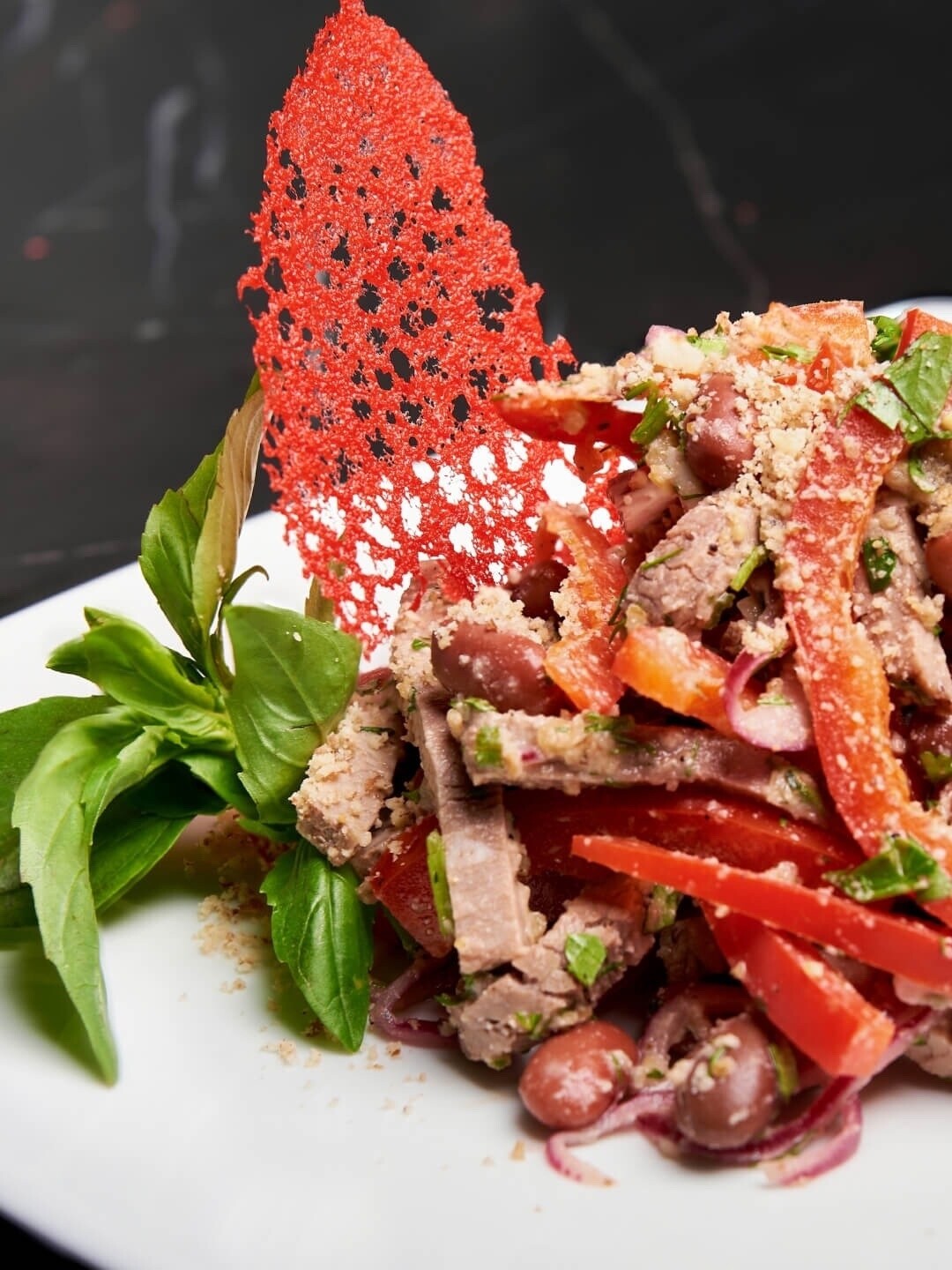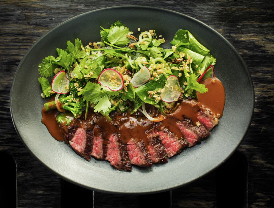 В меню ресторана – новинка. Здесь теперь подают скерт-стейк – необычно широкий стейк, который вырезают из тонкой мышцы диафрагмы. Готовят его на открытом огне – фишка ресторана, а подают с зеленым салатом и соусом лао из ферментированных черных бобов и корнеплодов.