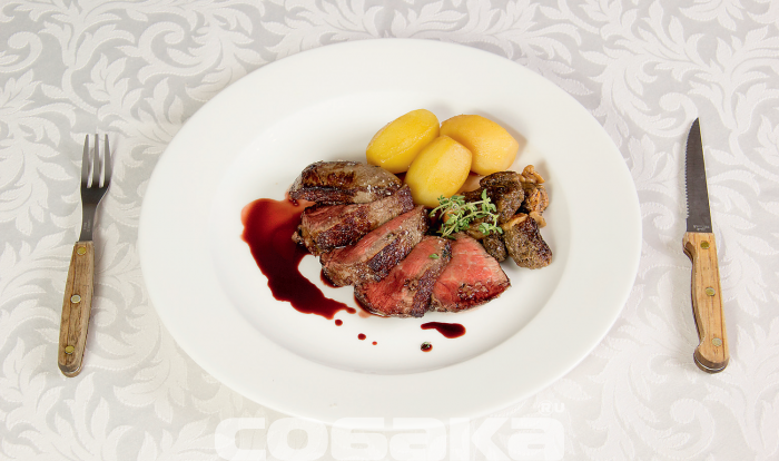 Подаем с карамелизированным картофелем, грибами и соусом.
