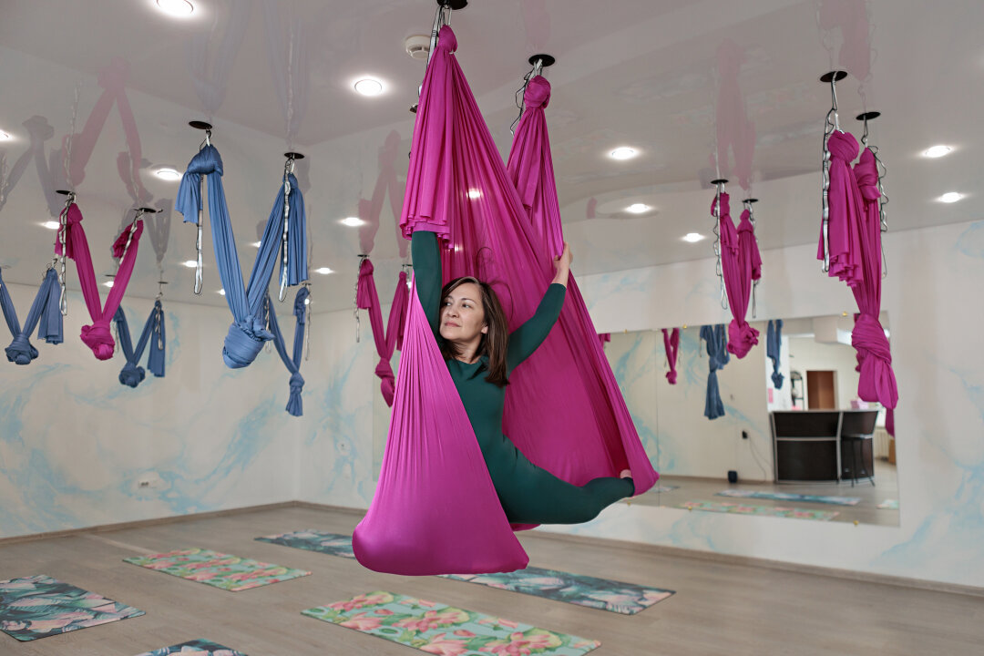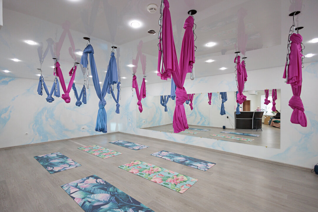 Аэройога – одно из самых популярных направлений студии. Занятия проходят с использованием настоящих американских специально разработанных для йоги гамаков, подвешенных к потолку. Эти занятия развивают гибкость, очень быстро подтягивают тело, снимают напряжение в спине, улучшают лимфоотток и активизируют глубокие мышцы тела. Полезно и при малоподвижном образе жизни, и тем, кто давно ищет максимально эффективный вид йоги, где есть и гибкость и сила.