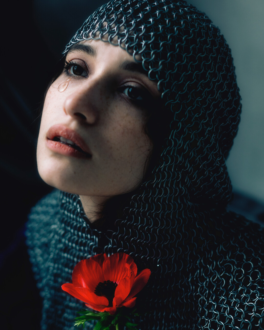 Да, была одна фотосессия. У многих мои фотографии ассоциируются с «невинной» женской нежностью. Это так, но я думаю, что пробовать что-то новое очень важно для творчества. Мне хотелось показать женскую красоту с сильной и даже воинственной стороны. Кольчугу и меч я взяла в аренду, а красное платье пришлось сшить. До съемки оставалась буквально пара дней, я была очень загружена, но видела только красное бархатное платье. Сходила за тканью и попросила в ателье помочь мне с выкройками, так как самой мне было бы сложно управиться. Выкройки были готовы, и в вечер перед съемкой я села шить.