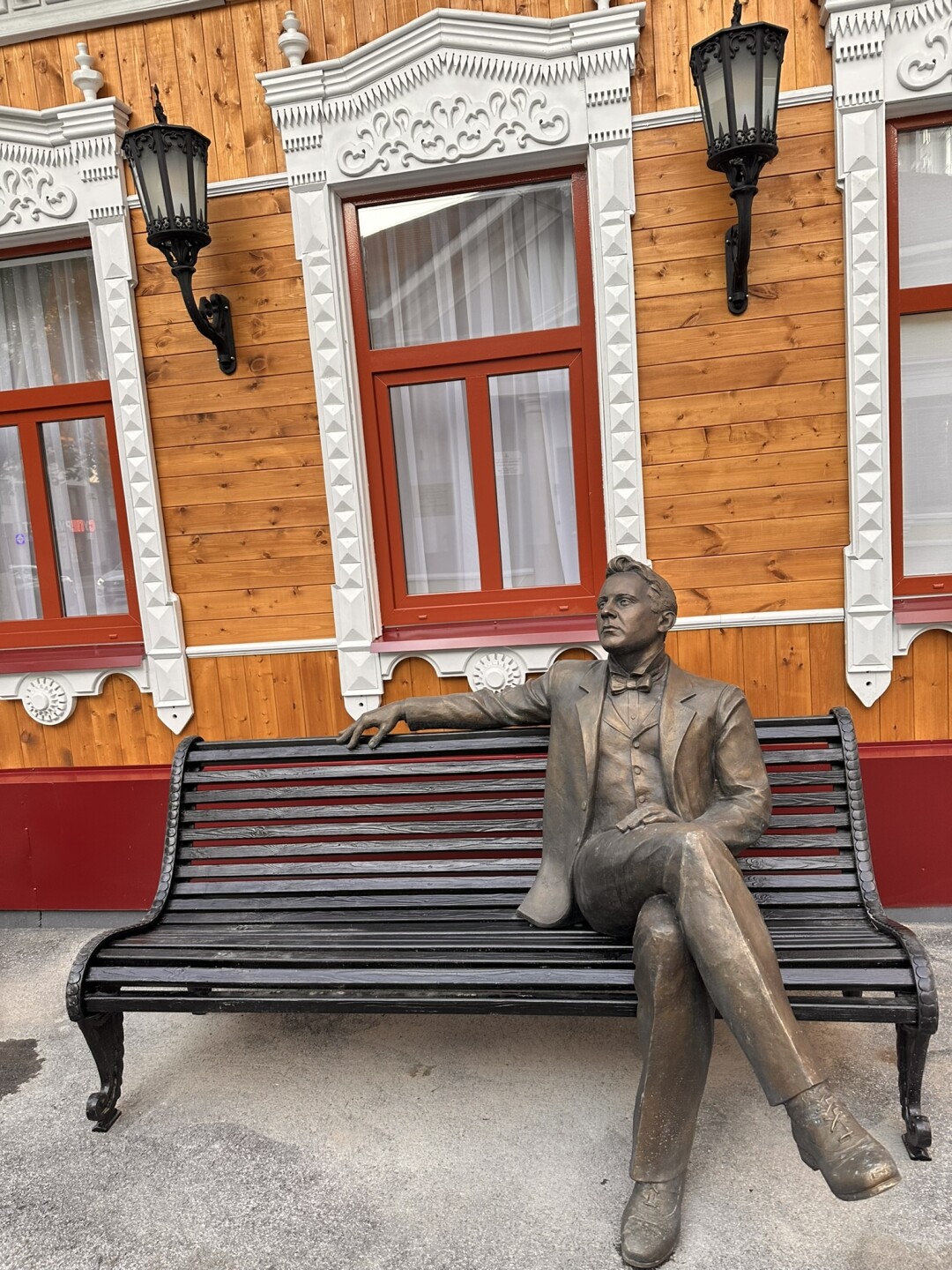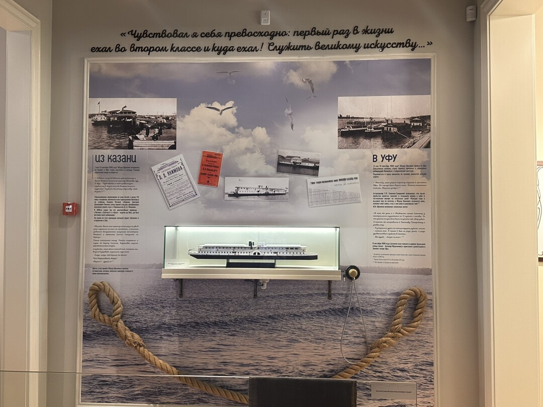 В музее легко ориентироваться: сначала мы знакомимся с Уфой музыкальной, потом видим корабль, на котором приехал Федор Шаляпин, и комнату, где он жил. Далее – закулисье, афиши и истории, которые случались с ним в Уфе. Следом – гримерка, где Шаляпин сам создавал образ для выступления. Затем – коридор с портретами важных для него людей и небольшой концертный зал, где мы проводим музыкальные вечера.