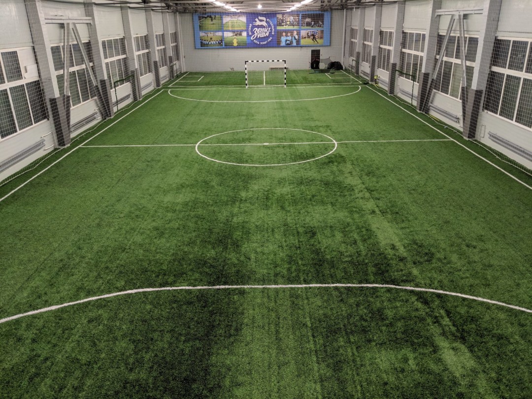 В крытом манеже для активной игры есть основное поле для футбола и дополнительное, меньшего размера. Покрытие – искусственный газон с разметкой. Есть раздевалки и душ. В зале проходят тренировки детского футбольного клуба, поэтому бронировать время нужно заранее.