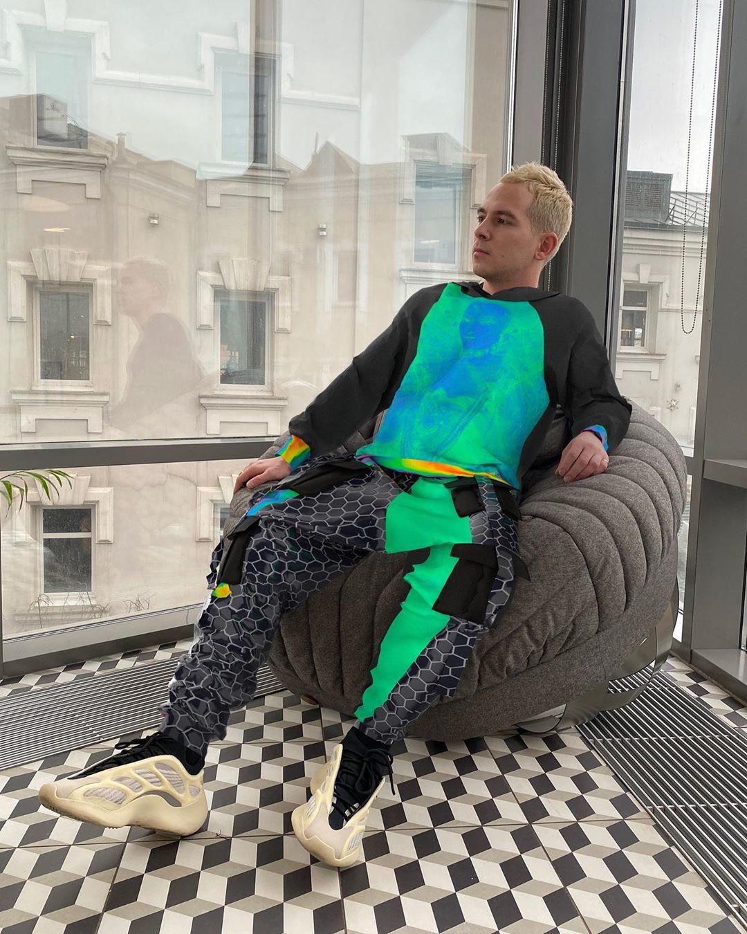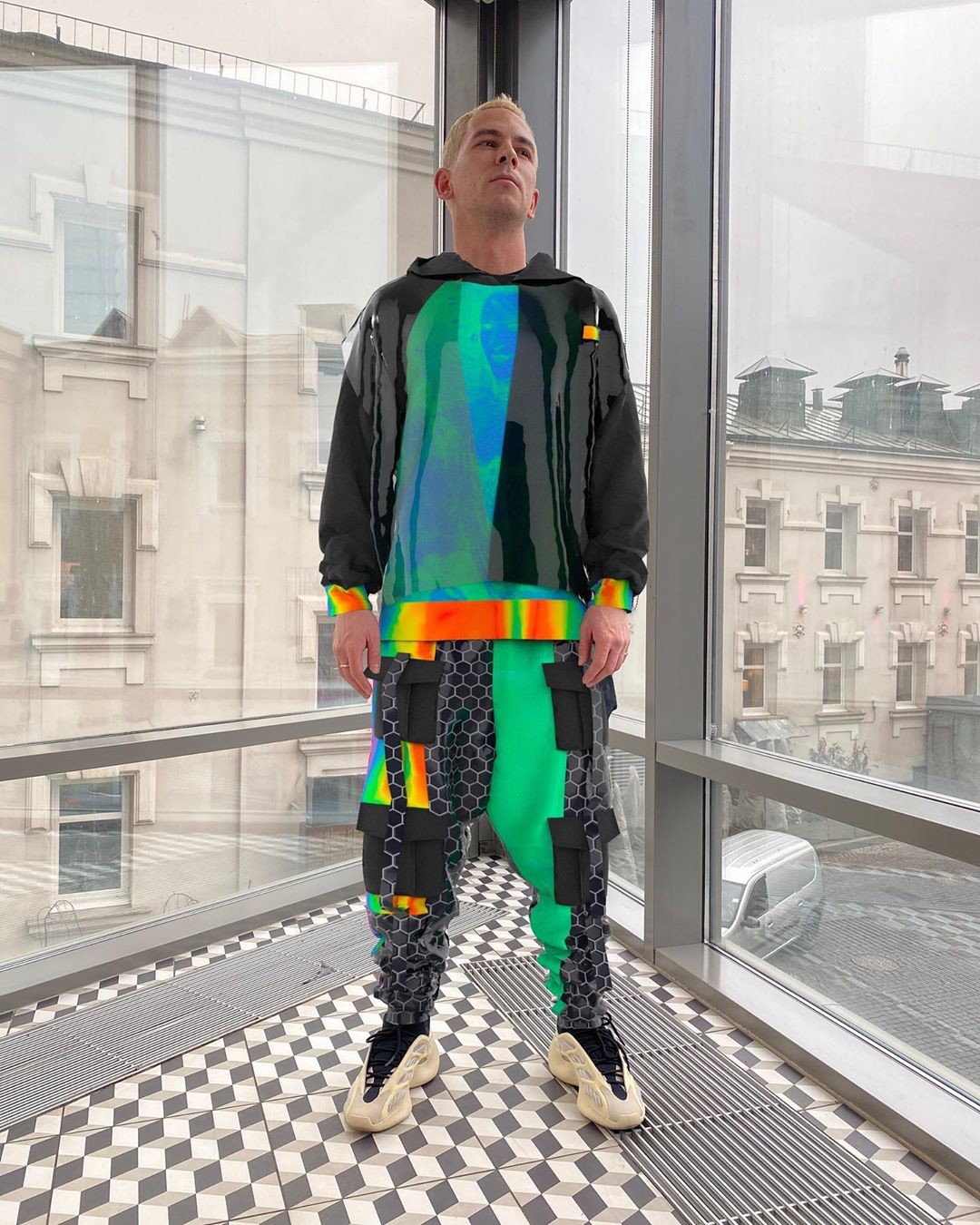 Первым большим проектом можно считать 3D-лук для Дани Трабуна. Его я выполнила где-то за неделю, или 10-12 часов чистого времени. Сначала была фотосессия в офисе Яндекса – для создания виртуального образа нужна фотография, сделанная в интересной локации, на человеке должна быть обтягивающая одежда. После фотосессии Даня прислал свои референсы: то, что ему хотелось бы увидеть в финальном варианте, – это был первый раз, когда я ориентировалась на чье-то мнение при создании дизайна. Дальше, как и при создании реальной одежды, все началось с поиска вдохновения, различных идей. Сначала делала скетчи на бумаге и айпаде. Один из графических элементов этого лука – интерпретация классического портрета королевы Елизаветы I. Это отсылка к ДНК моего бренда Ophelica. Я просто обожаю такие картины, и часто это отражается в моих работах.