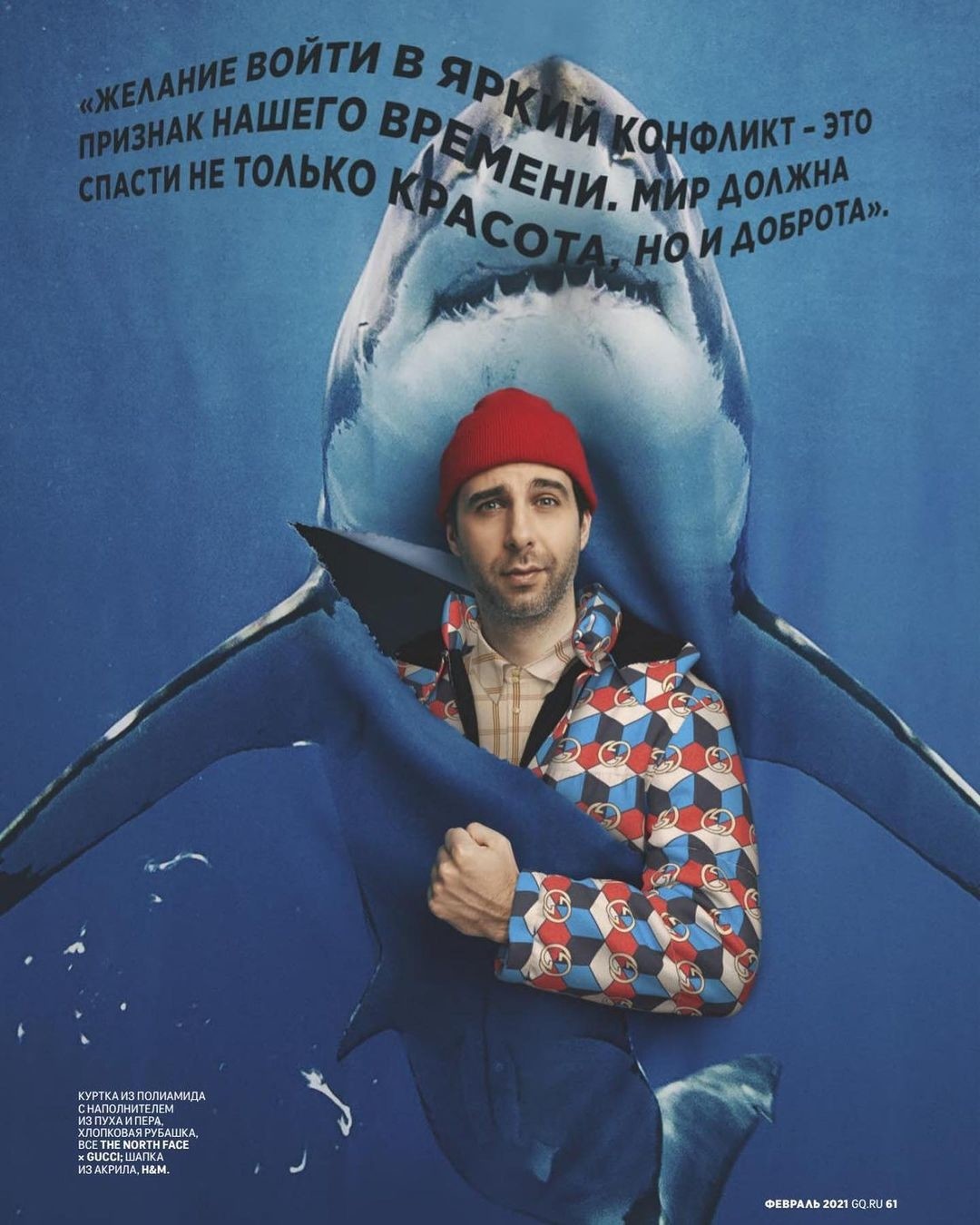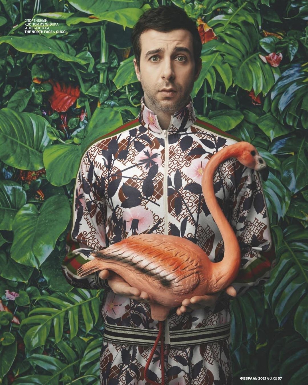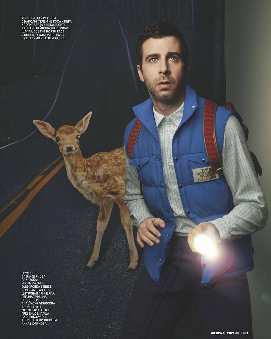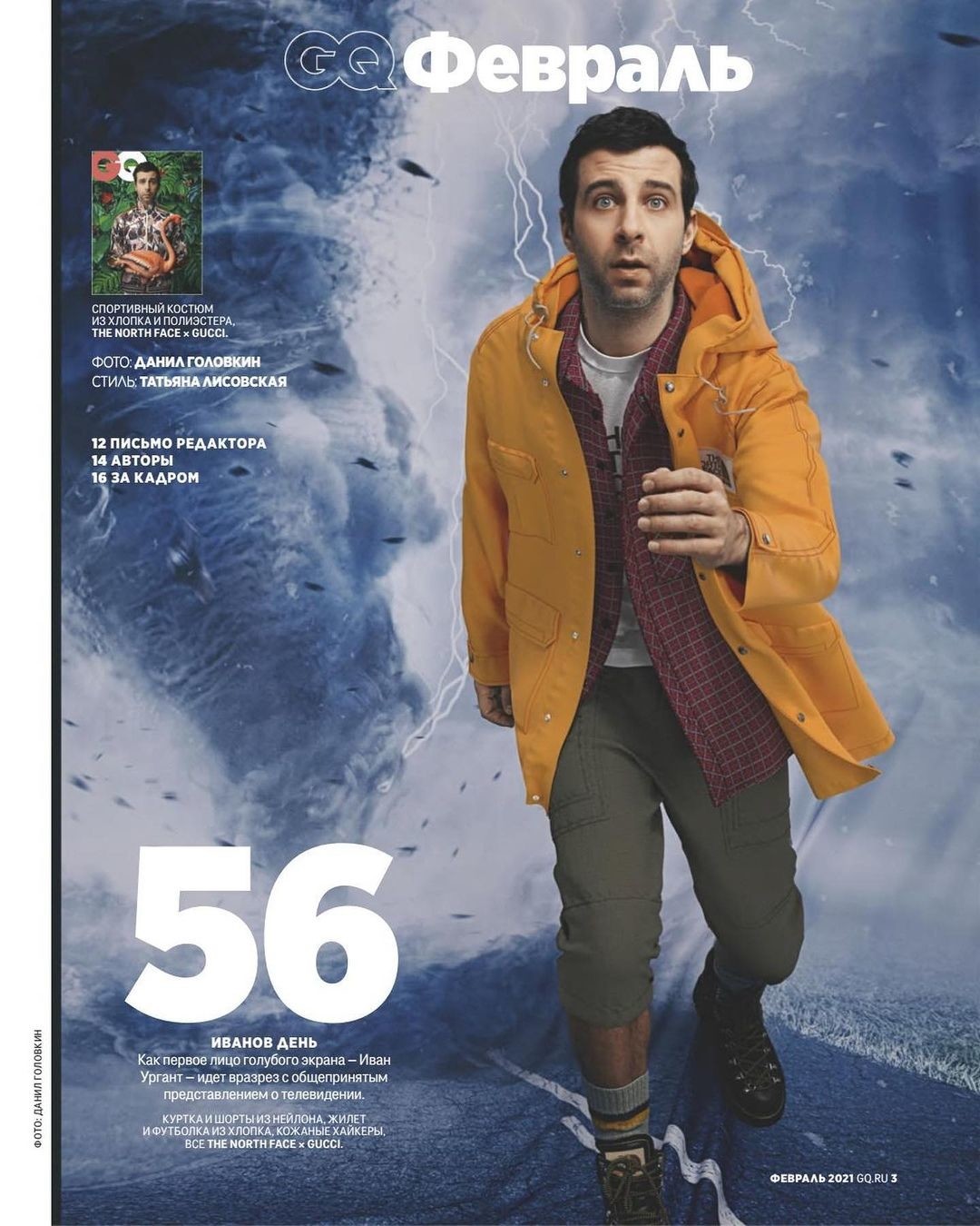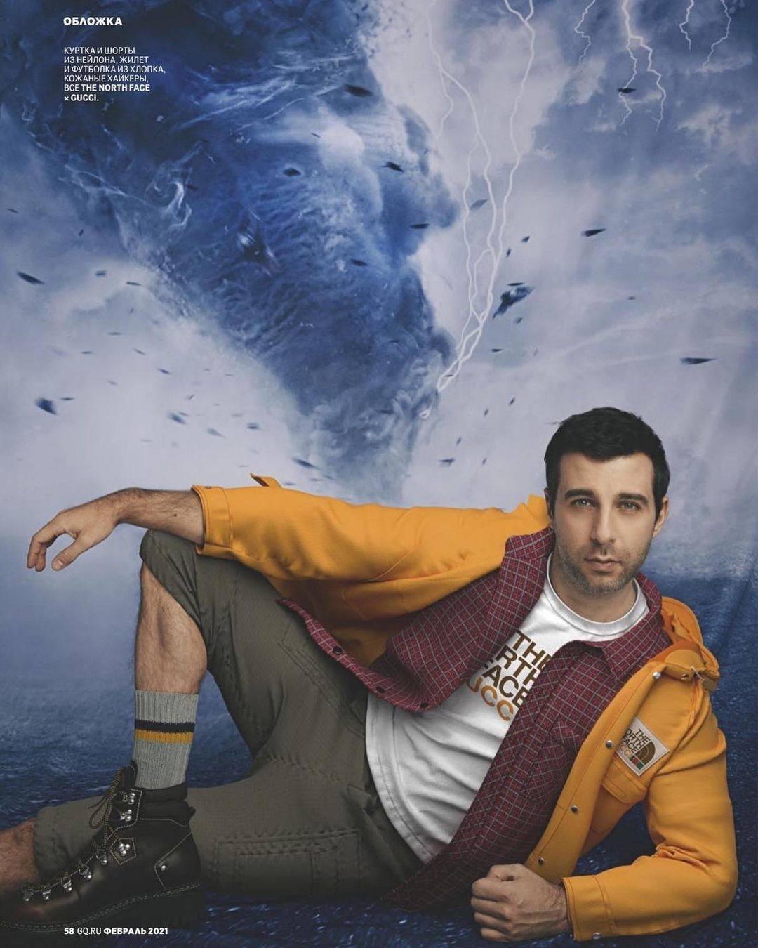 Основательница бренда Ophelica и первого в России онлайн-ателье Replicant Регина Турбина одела Ивана Урганта в цифровую одежду от The North Face и Gucci для февральского номера GQ.