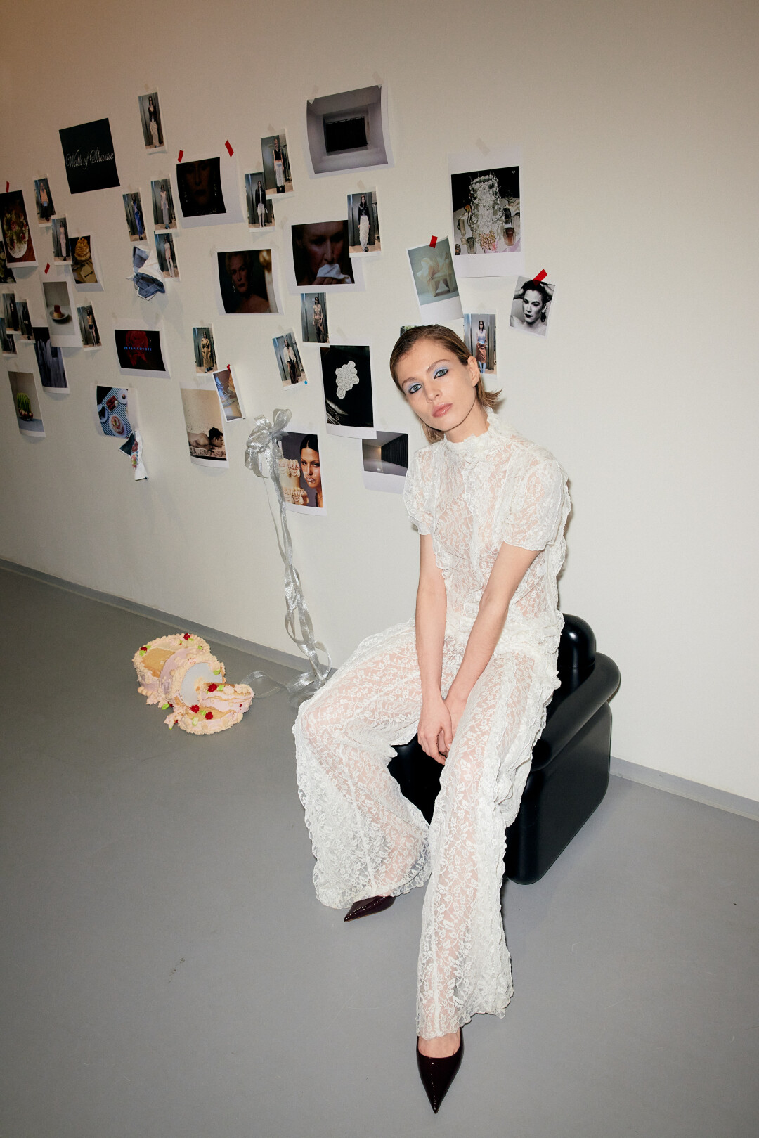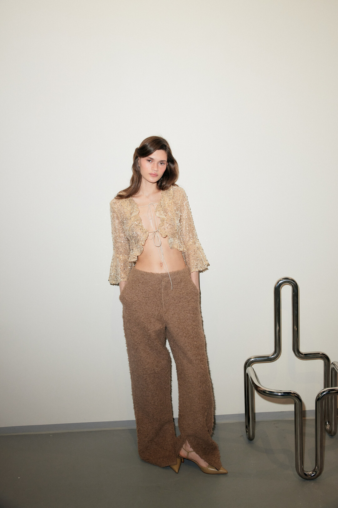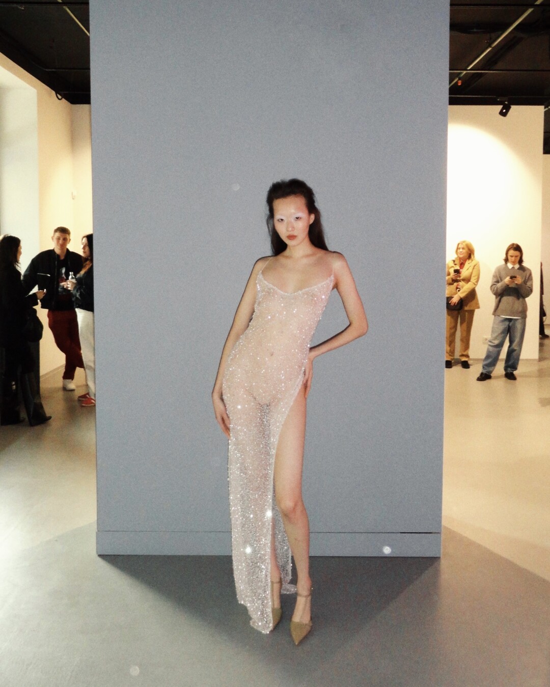 Есть в коллекции и знаковые для Walk of Shame элементы, которые можно было видеть в архивных коллекциях бренда. Это и кружевная вышивка-ришелье, напоминающая украшения национальных башкирских полотенец, и мини-зеркала на тюлевых юбках (ручная работа!), и надписи фирменным ретро-шрифтом, и конечно, пайетки, которые на этот раз рассыпались по невесомому супермакси-платью.