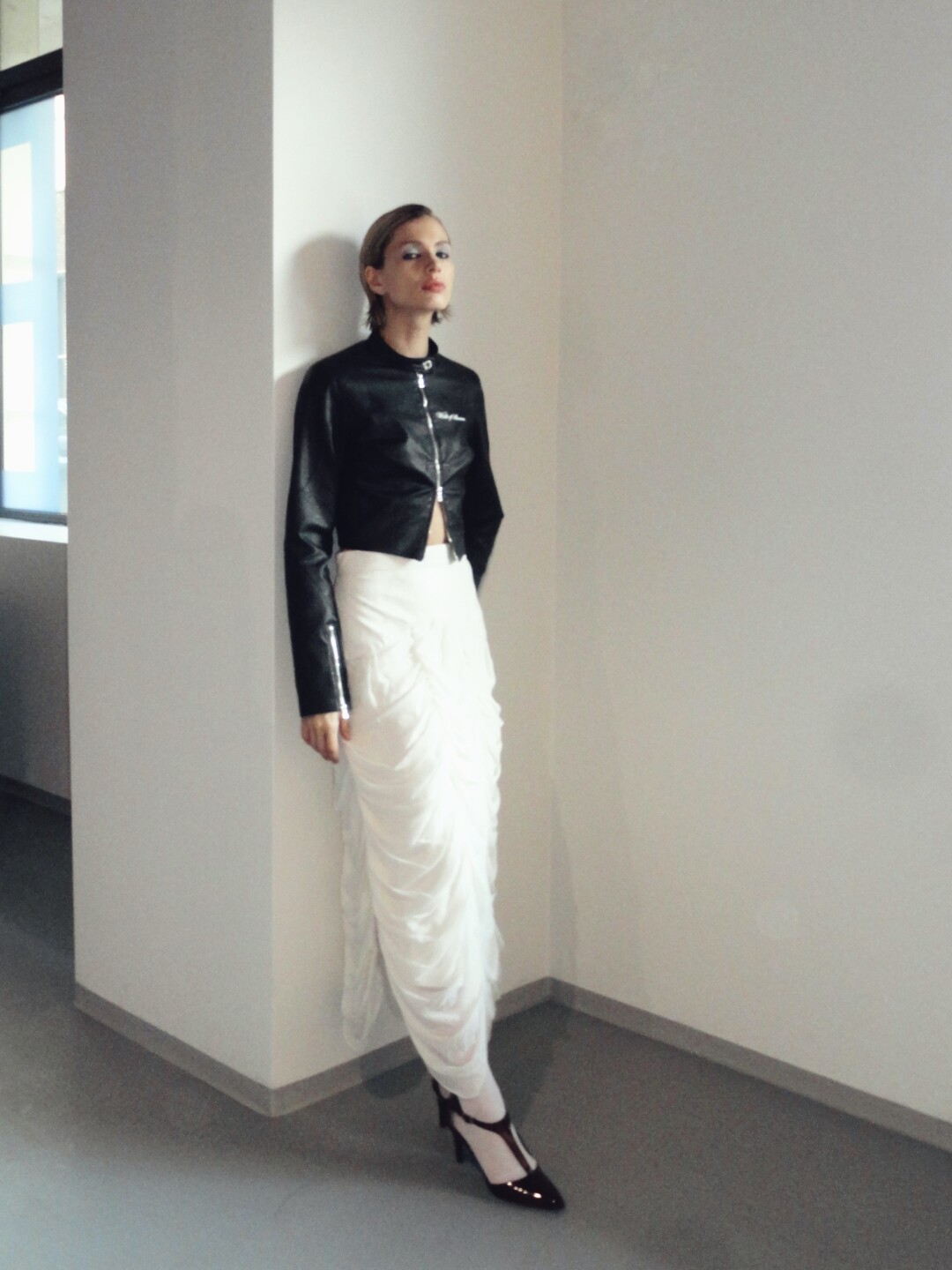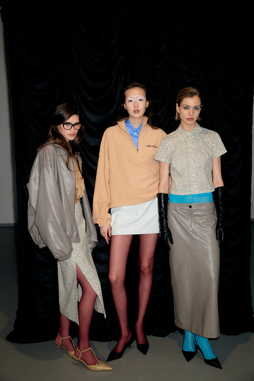 Коллекцию дополнили оверсайз-бомберы, жакеты классического силуэта, костюмные юбки на низкой посадке, укороченные рубашки и топы с логотипом.