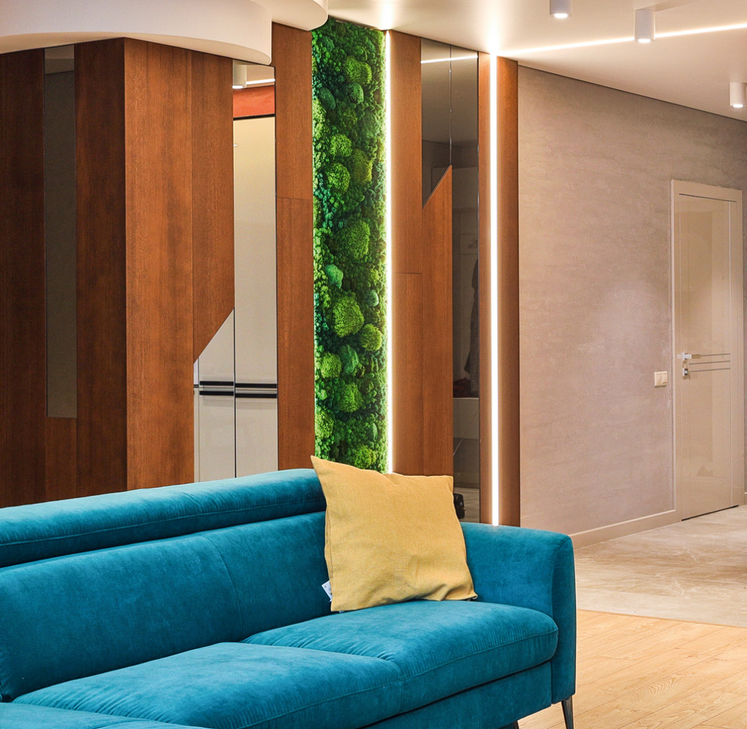 Владелица квартиры хотела сложный многогранный интерьер в современном стиле с яркими акцентами. Зонирование учитывало тот факт, что семья часто бывает в разъездах, но, если уж все дома, в гостях собираются сразу три поколения: и хозяева, и дети, и внуки. Поэтому дом должен был быть уютным, приветливым и удобным.