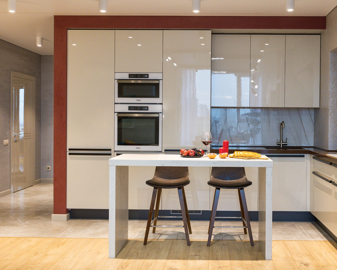 Для фасадов, изготовленных индивидуально, была выбрана высокоглянцевая эмаль. Фасады шкафов выполнены из ламинированной плиты в эмали. А эффектный пенал под дерево с декоративными аксессуарами, притягивающими взгляд, изготовлен из термоструктурированных панелей.