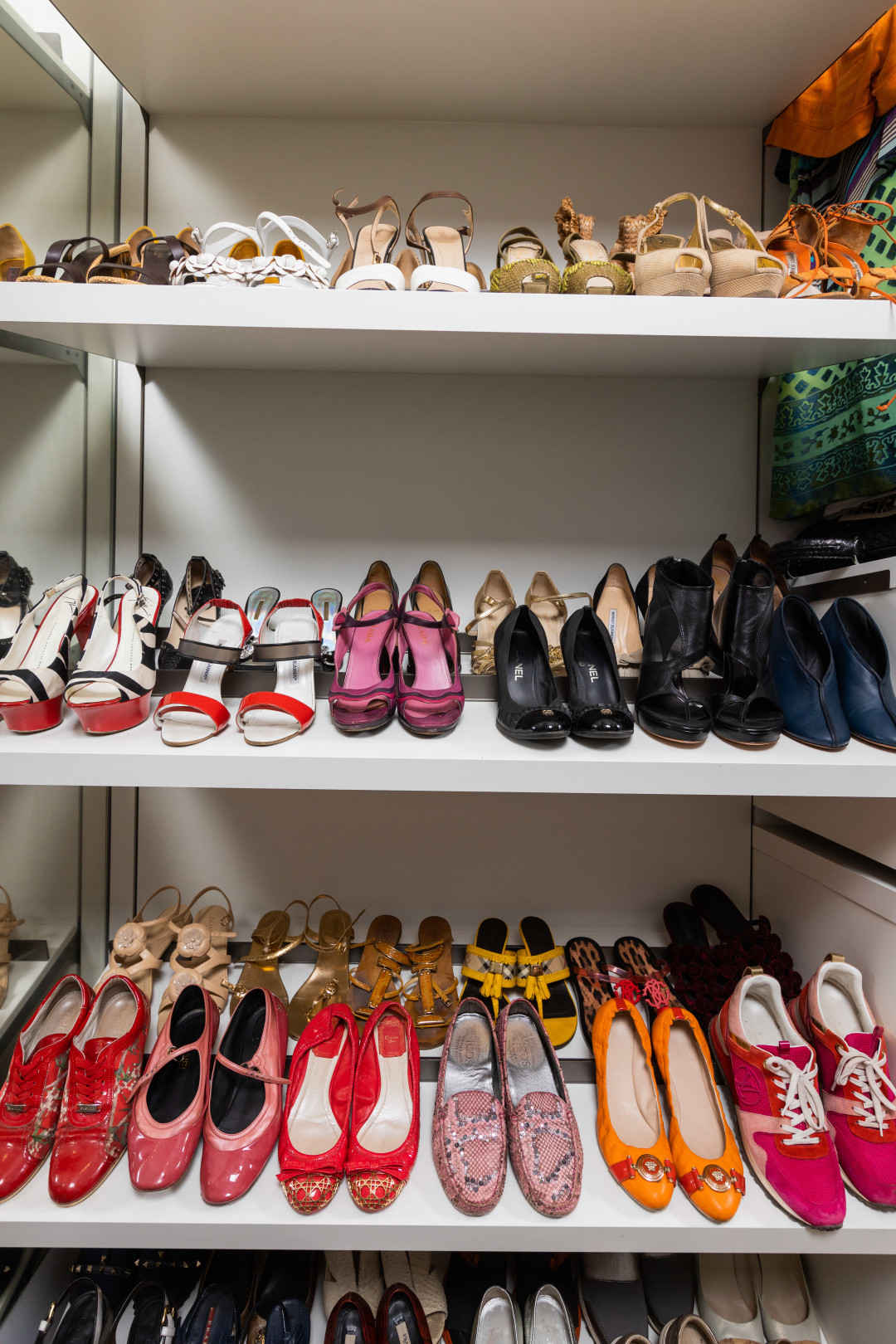 Моя любимая часть гардероба – «обувничка». Это ряд наклонных полок с двумя держателями для обуви. Он очень функционален: появляется возможность расставить обувь по два ряда на полку, по шесть пар обуви в каждый ряд.