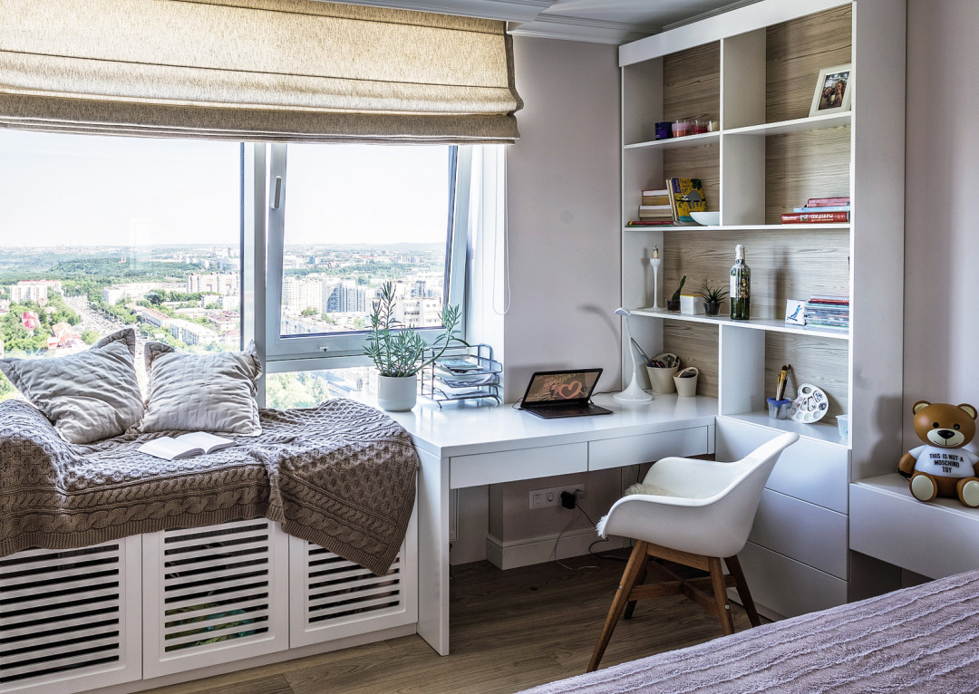 Не менее интересной получилась комната дочери. Девушка сама активно участвовала в разработке дизайна. Для производства этой конструкции, а также гардеробных в обеих спальнях использовали ЛДСП Egger и фурнитуру.
