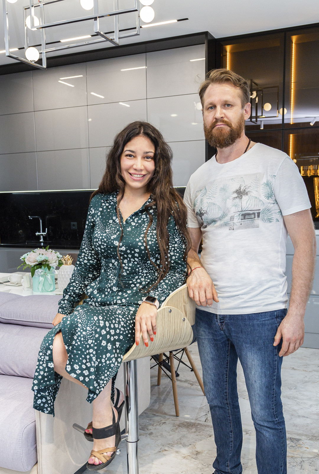 Освещение доверили профессиональной команде. Ее основатель лично участвовал в проекте: в индивидуальном порядке была изготовлена уникальная люстра с восемью светильниками. Ее выполнили с учетом актуальных требований интерьерной моды.