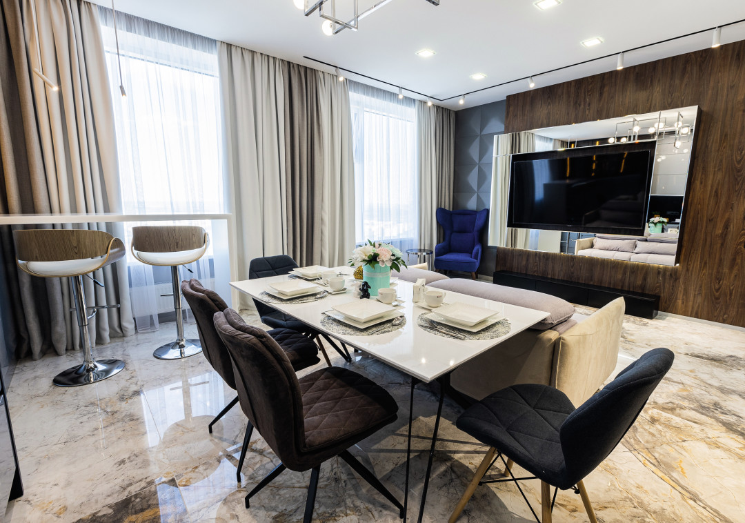 Привлечение опытных партнеров, правильный выбор мебели, грамотная расстановка цветовых акцентов и нюансов позволили создать качественный, эстетически привлекательный интерьер вне времени. Пространство поделили на просторную кухню-гостиную со столовой и барной зоной, и уютную приватную зону. Предусмотрели вместительную гардеробную и просторный санузел. Задачу экономии пространства удалось выполнить на 100%.