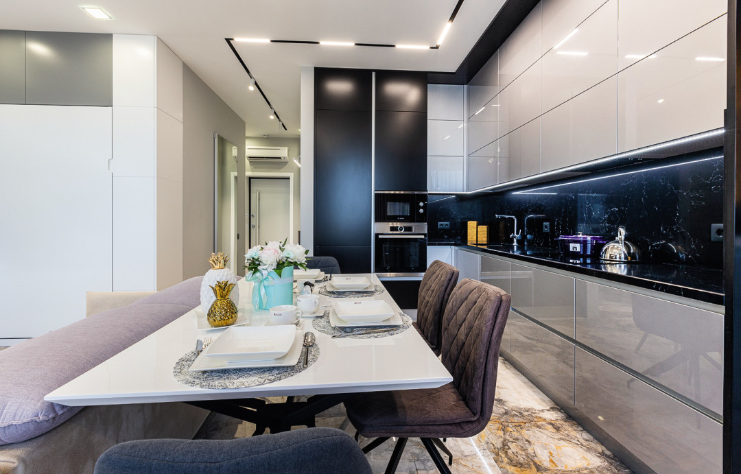 На Г-образной площади «умной» кухни использовали встроенную мебель. Здесь множество интересных технологических решений. От верхних шкафов с подъемным механизмом для удобного доступа до мобильного барного стола, который можно переместить к окну или столовой зоне. Для барной зоны и кухни подобрали стулья, которые оживили интерьер, сделали его еще более трендовым и стильным.