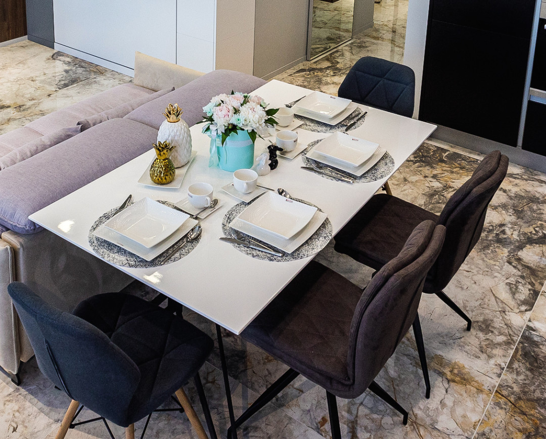 Для помещения приобрели белоснежный фарфор, бокалы, столовые приборы, чугунный кокот оттенка «кобальт» и другие аксессуары и посуду.