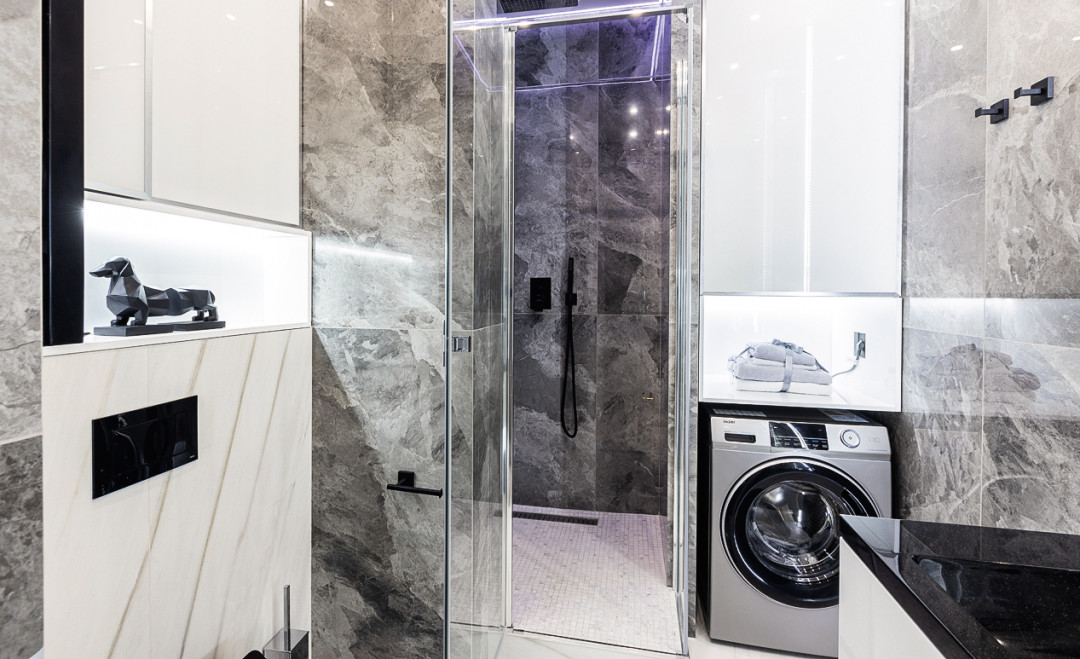 В продолжение идеи функциональности во всех помещениях пол выложили долговечным и износостойким крупноформатным керамогранитом, в отдельных зонах установили «теплый пол». Грамотно расположили розетки и выключатели. Разнообразие фактур и цветовых оттенков в интерьере подчеркнули с помощью грамотно подобранной подсветки.