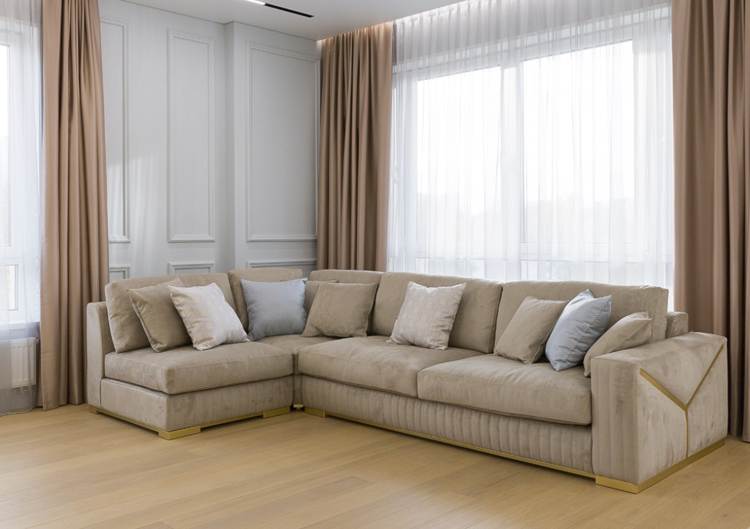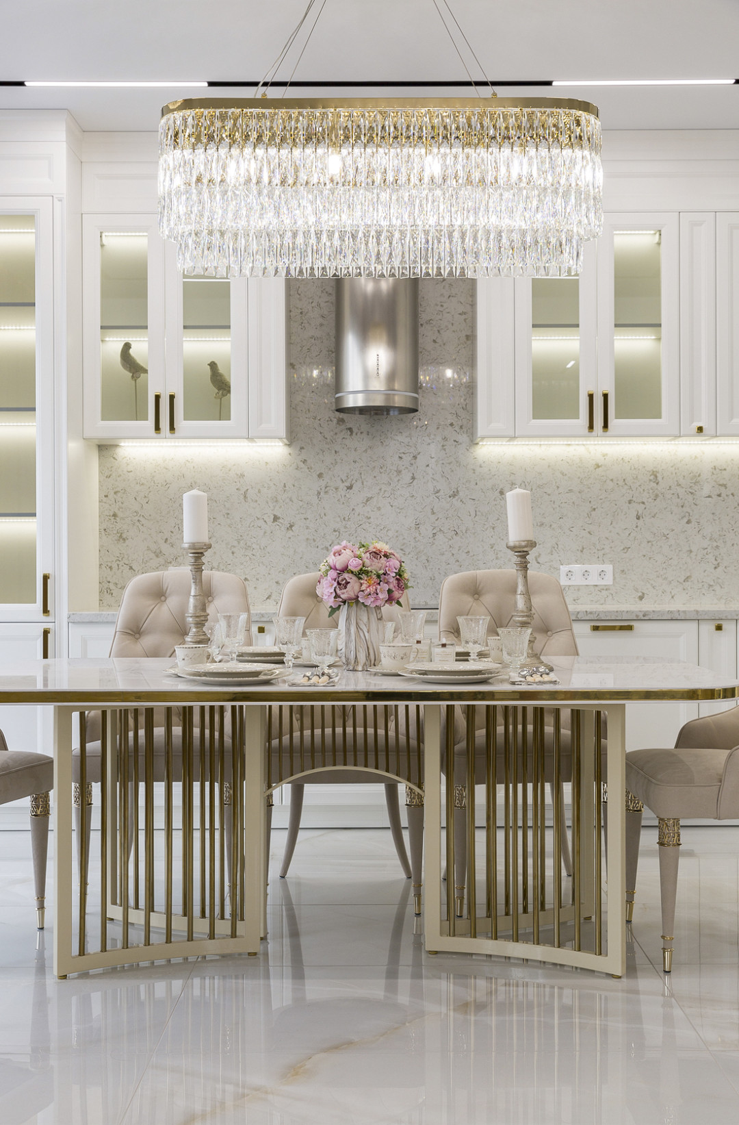 Диван и вращающееся кресло выполнены из натуральной замши Formerin Italia, задающие тон всему интерьеру. Для проекта эти эксклюзивные предметы изготовили и привезли из Италии в индивидуальном порядке. Например, по спецзаказу сделали реплику обеденного стола от итальянской фабрики. Эксклюзивный арт-объект украшает кухню-гостиную, имеет столешницу из американского кварца, фурнитуру из латуни и выкрашен в молочно-белый цвет.
