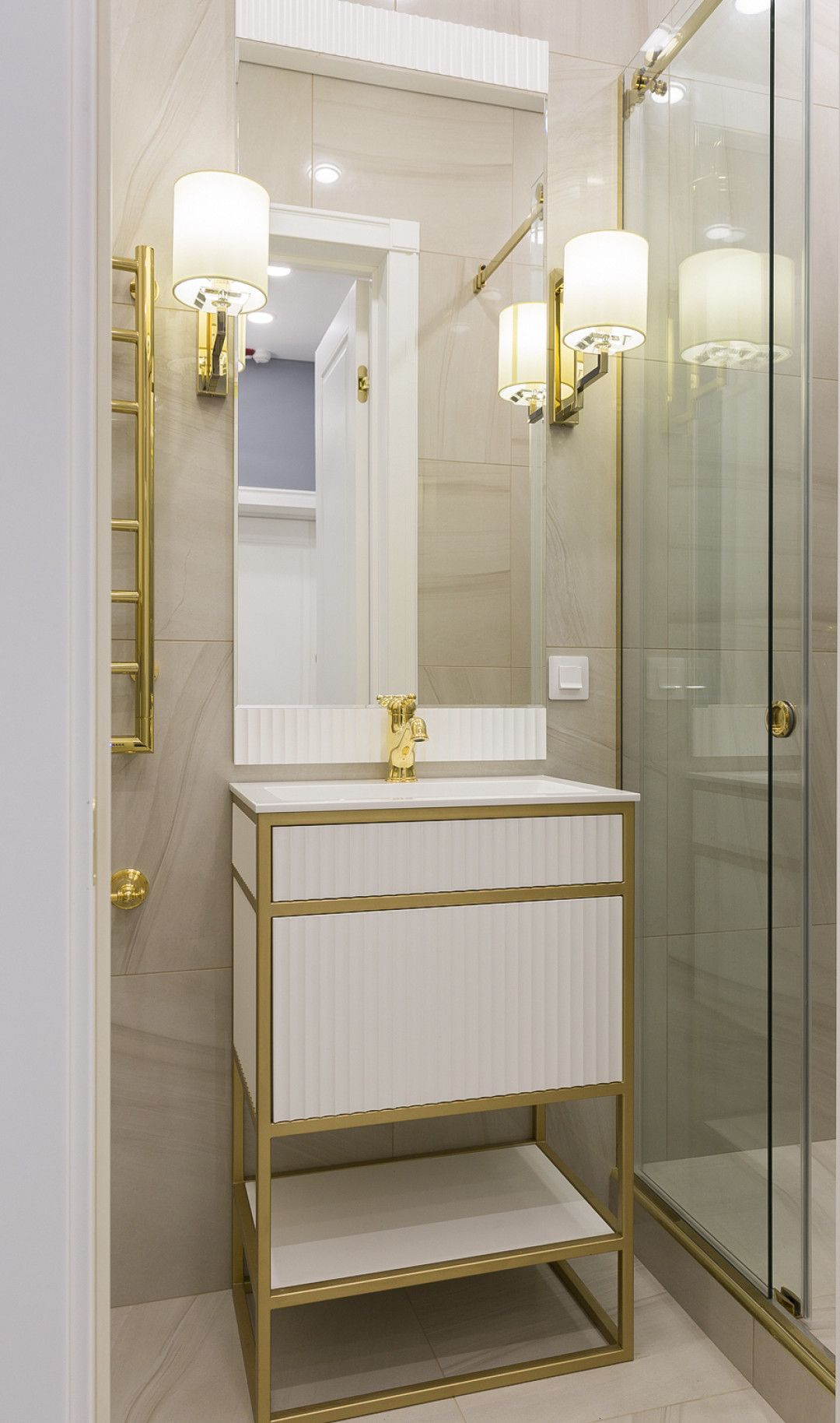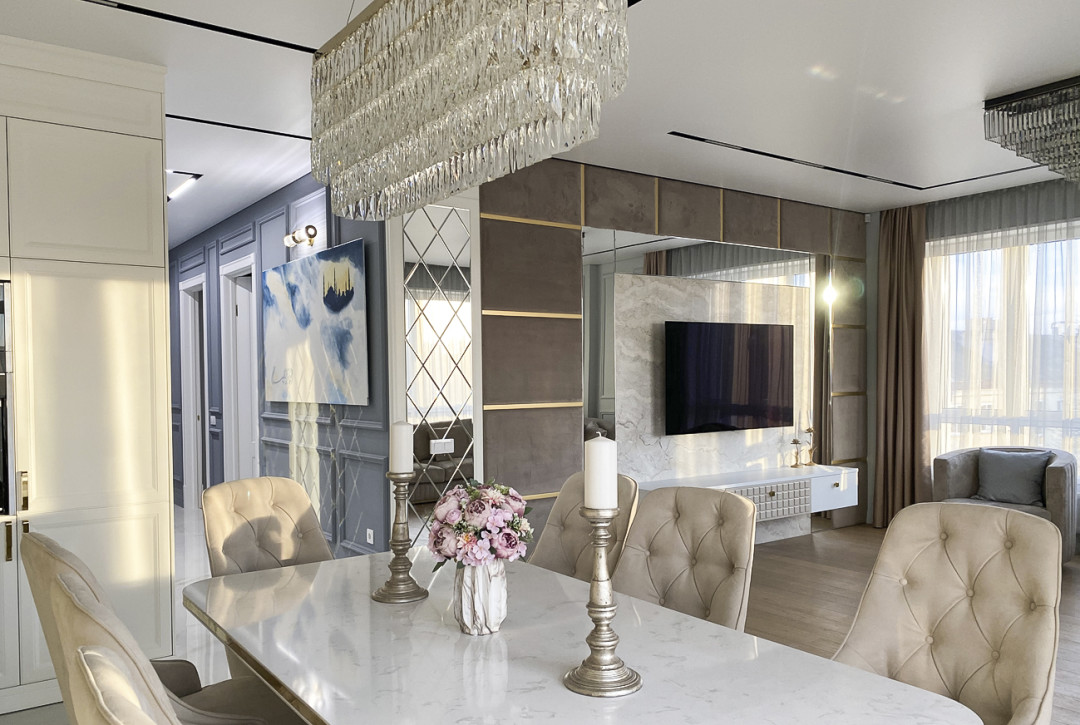 Важно было найти баланс между легкой помпезностью и вычурностью традиционного ар-деко и геометричностью и эргономикой современного стиля. Мы сделали акцент на необычную мебель и натуральные ткани, при этом позаботились об многоуровневом освещении, использовали актуальный керамогранит и выполнили полную перепланировку квартиры. Увеличили пространство кухни-гостиной и двух санузлов, отвели дополнительное место под гардеробную. К реализации проекта я привлекла опытных партнеров, с которыми работаю много лет.