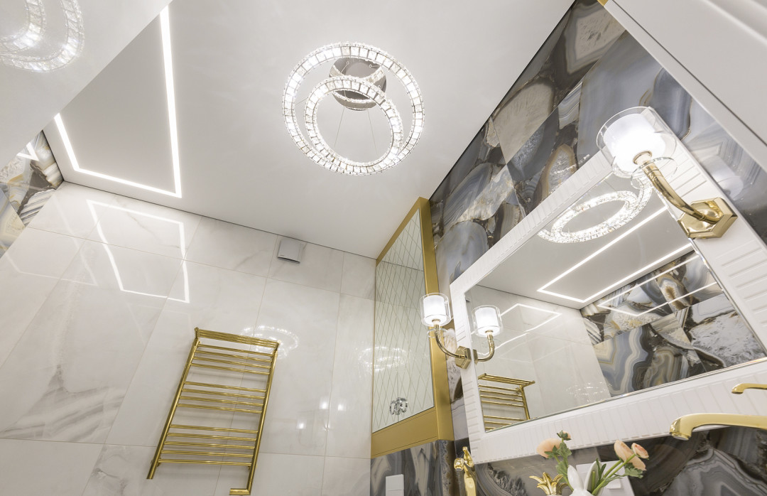 Ар-деко не терпит ни малейшего проявления небрежности в работе с пространством. Оформление теневых потолков во всей квартире производилось по чистовой отделке: такая последовательность обеспечивает идеальный внешний вид и геометрию теневого профиля, а также идеально встроили сложную систему магнитных шинопроводов, световых линий, нестандартных светильников. Строгие геометричные конструкции эффектно подчеркнули световые решения.