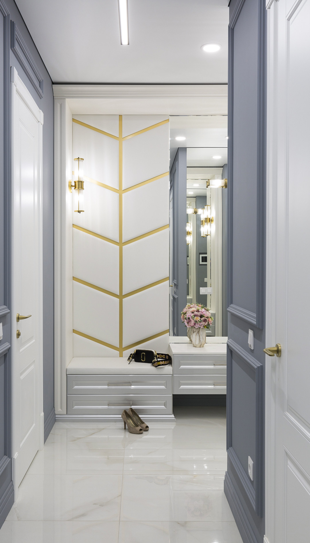 Всю корпусную мебель на кухне, в ванной, в комнатах, а также декоративные мягкие стеновые панели и зеркальные панно выполнила одна студия мебели. Замысловатое изголовье кровати, мягкие тумбы и туалетный столик, а также все стыки между сегментами мебели оформили латунными вставками. Металлический отблеск появился повсюду: в потали на мебельном декоре, в лицевой фурнитуре, на золоченых ножках. Фасады для шкафов с трехмерными рельефными рисунками покрыли эмалью в цвет стен. Такие решения помогли создать целостное впечатление от интерьера.