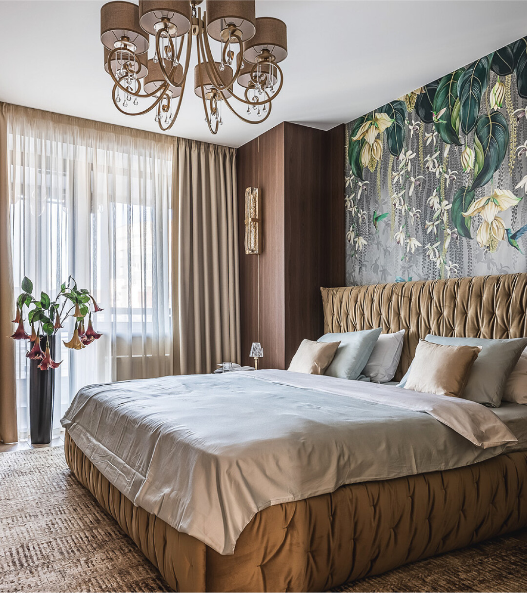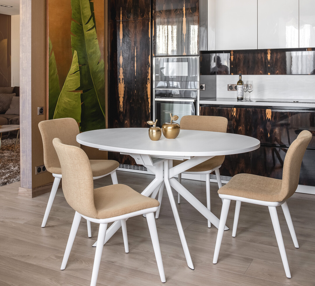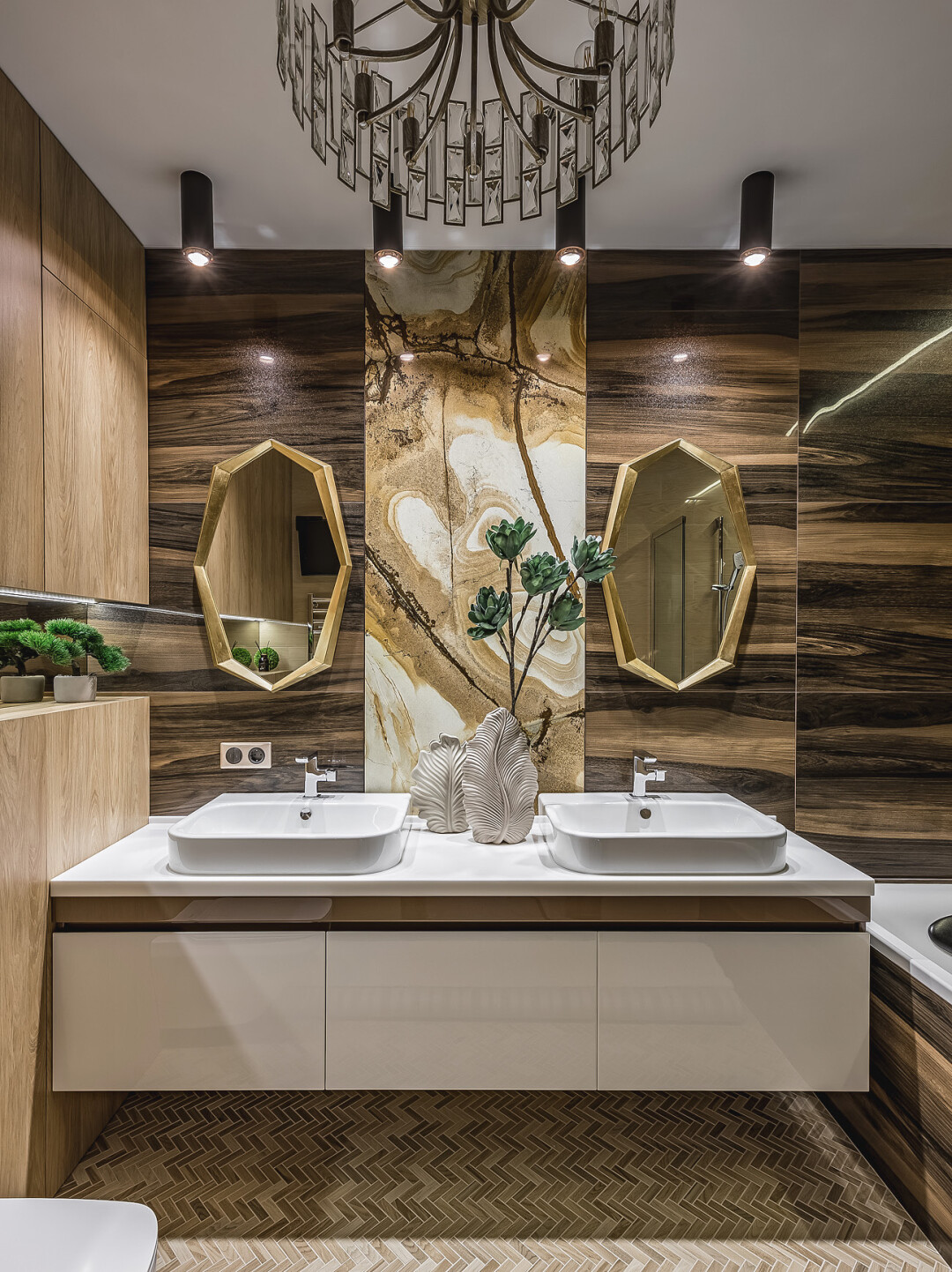 Этот проект мне особенно дорог: с заказчиками мы реализовали уже два коттеджа, поэтому уровень доверия между нами максимальный. Зная их вкусы и предпочтения, стояла задача не повторяться. В основе моих работ всегда лежит базовая идея, которая передает настроение в интерьере и раскрывается через цвет, форму и отделочные материалы. В этот раз я предложила смелое сочетание горького шоколада с апельсиновой «начинкой», причем с элементами этники. Поэтому в квартире можно встретить танцующих слонов в сюжетах английских обоев, а листья бананового дерева на картинах и глянцевые фасады кухни раскрывают невероятную текстуру шпона экзотической породы дерева зирикота. С ними прекрасно рифмуются медовые оттенки оникса.