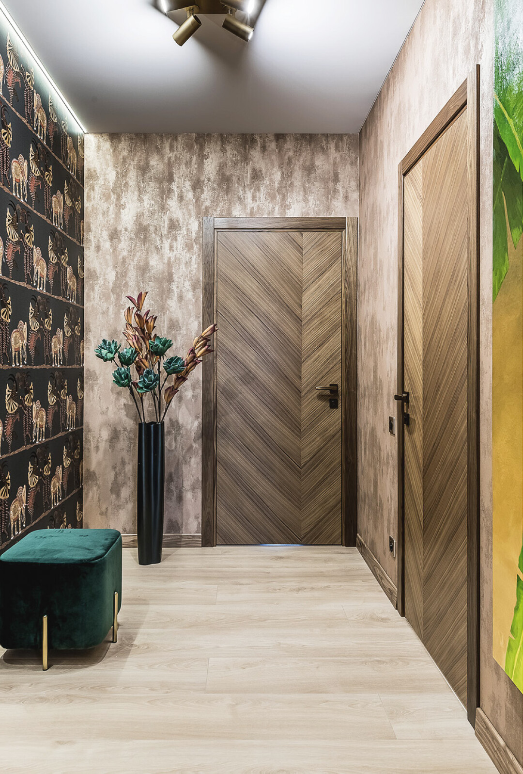 Напольное покрытие выглядит лаконично и спокойно, оттеняя фактуры других поверхностей. В работе над дизайн-проектом я решаю три базовые задачи: планировку, колористику, стиль. И уже после подбираю отделочные материалы, встроенную и мягкую мебель, текстиль и декор. Ключевой задачей стала планировка. Мы начали с полного демонтажа – и после того, как раскрылся весь потенциал квартиры, полностью перекроили пространство и его логистику. Избавились от лишних коридоров и проходных комнат, расширили спальню и детские, функционально организовали пространство кухни. Нашлось место и для второго санузла с душевой, и для большой гардеробной с постирочной. В проекте использовали много дверей: модели скрытого монтажа, поверх которых мы клеили обои, а также ореховые двери с разнонаправленным шпоном.