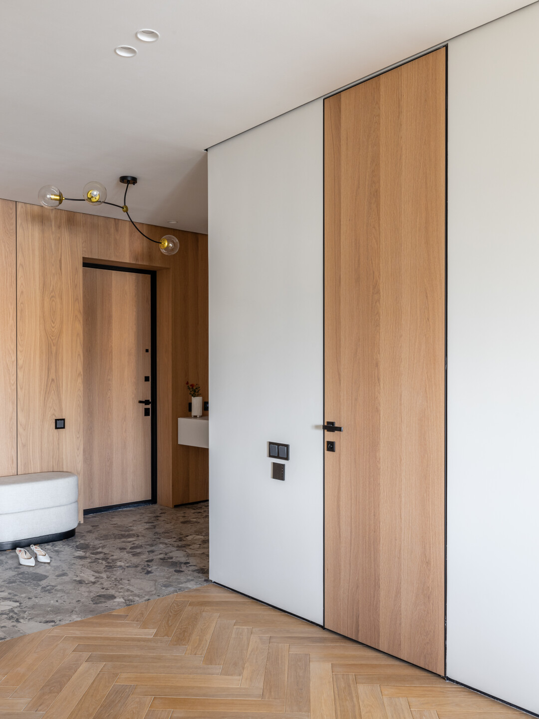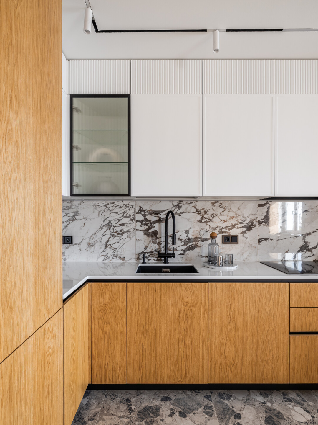Эргономичная встроенная кухня от Julce Kitchen по желанию заказчика дополнена барной стойкой с графичными и минималистичными полубарными стульями, которые мы заказали в Top Concept. Открытые полки притягивают к себе взгляд благодаря акцентному сочетанию: шпон в спокойном и естественном цвете «Дуб Грано» вступает в диалог с керамогранитом под мрамор от Italon Garda. Шпон и двери Invisible изготовила фабрика «Фрамир».