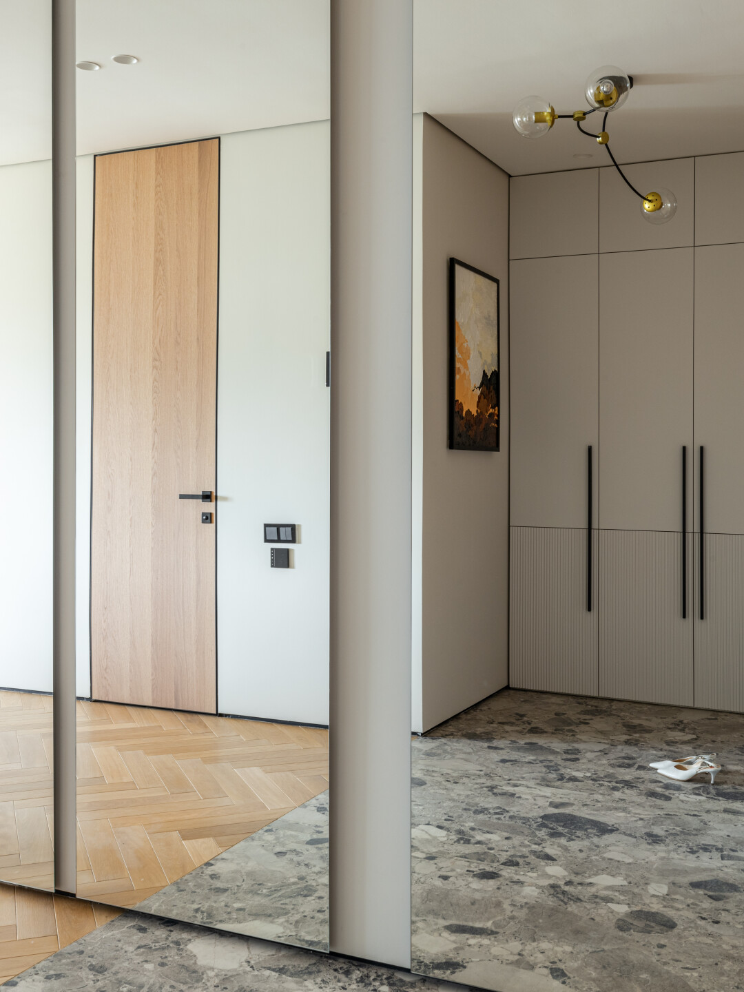 Системы хранения удачно спрятаны и не создают визуального шума. Встроенный шкаф с зеркальными фасадами в прихожей придает пространству дополнительную геометрию и объем. Бюро Julce Kitchen изготовило и установило вместительную гардеробную со стеклянными перегородками для мастер-спальни, а также корпусную мебель.