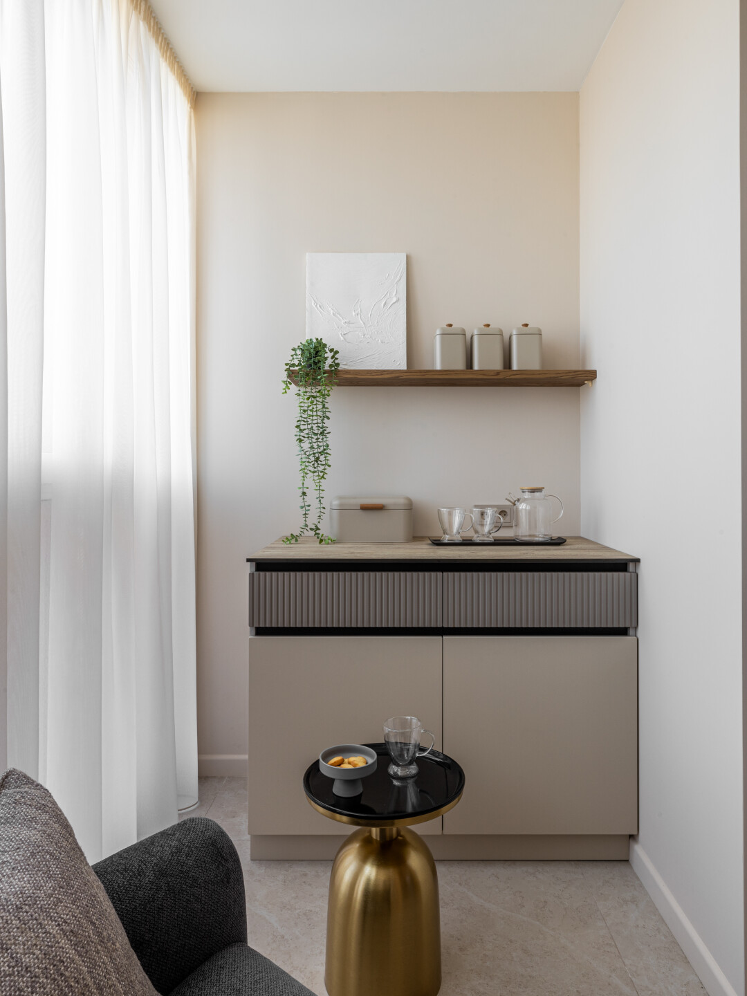 В первую очередь мы создали безупречную базу, выбрав в качестве напольного покрытия во всей квартире керамогранит цвета слоновой кости Italon от ТД «Дарада». Далее добавляли акценты и создавали атмосферу. Особого внимания заслуживает фартук. Кухня без верхних шкафов позволяет любоваться природной красотой травертина. У кухни есть отдельная чайная зона, где уютно пить чай у витражного окна. Зона гостиной представляет собой уголок спокойствия, за окнами которого кипит жизнь «Арт-Квадрата». Комфортный диван с регулируемыми подголовниками от Velvet придает статусность пространству.