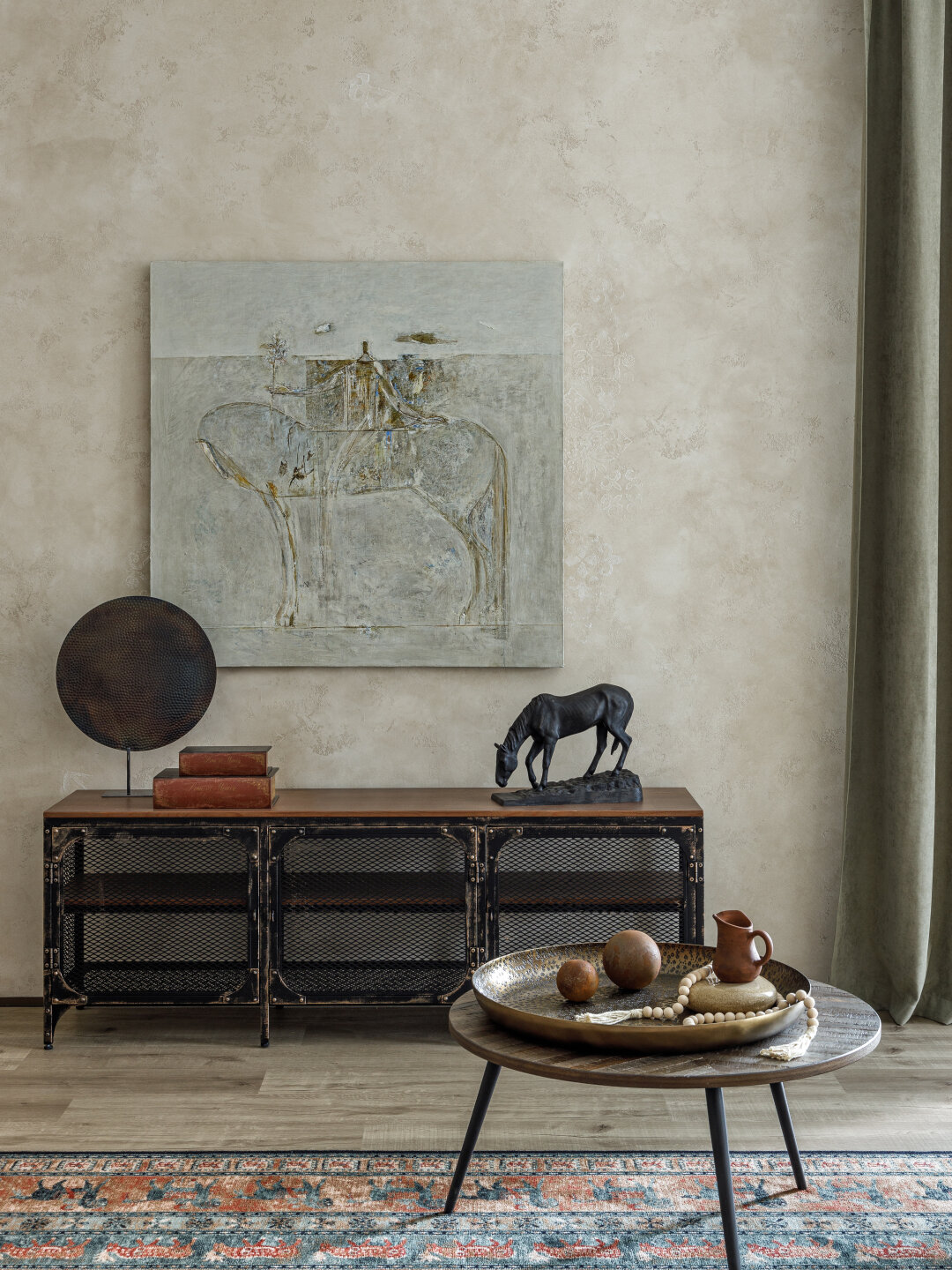 Если присмотреться, можно заметить, что стены в гостиной – это декоративная штукатурка с элементами родовой печати. Также эту комнату украшает панно с башкирским орнаментом, а дополняет композицию картина из серии «Всадники» талантливого художника Расиха Ахметвалиева. Декором интерьера служат предметы и утварь, которые достались Лилии от бабушек и дедушек: вазы, глиняные кувшины, кадка для изготовления кумыса, статуэтки лошадей, а также вышитые бабушкой полотенца. Антиквариат и винтаж – ключевые моменты этого проекта.