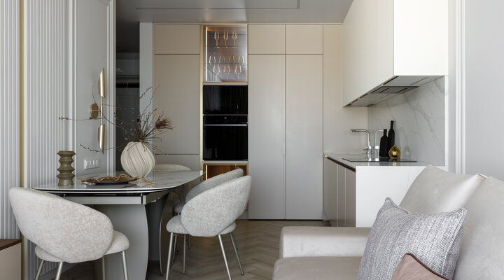 Кухню-гостиную оформили в духе современной классики, используя краску нежных пастельных тонов от Topcoat Boutique. На кухне первоначально предполагалась кладовая, которая портила геометрию пространства, но мы спрятали вход кухней от Areta Design. Справа расположили пенальную зону, куда уместили холодильник, духовой шкаф, системы хранения и микроволновую печь. Стол и стулья для обеденной зоны заказали в салоне Aran, их расположили рядом с рабочими поверхностями для готовки.