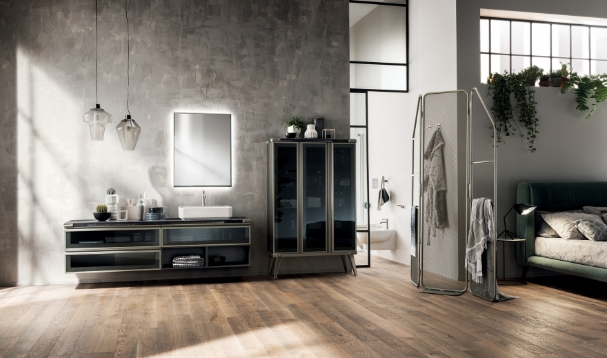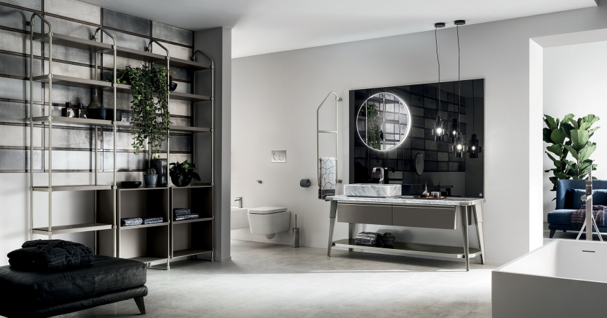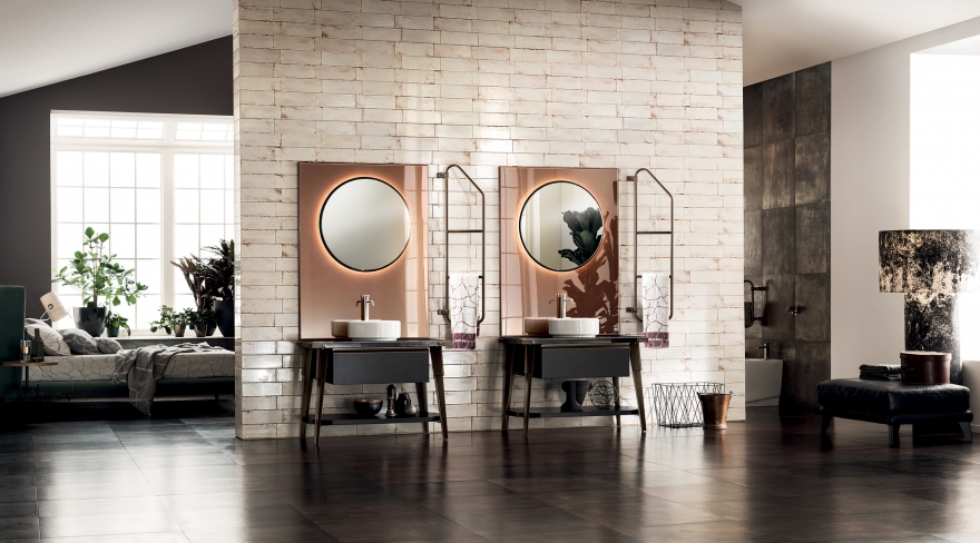 Diesel – это синтез индустриальной составляющей и домашнего уюта. В ванных бренда гармонично теплые тона сочетаются с темными цветами и матовыми отделочными материалами. Дополнительный контраст создают большие зеркальные поверхности с металлическими деталями. Несмотря на разные фактуры, используемые в отделке комнаты, ванные бренда гармоничны и функциональны.
