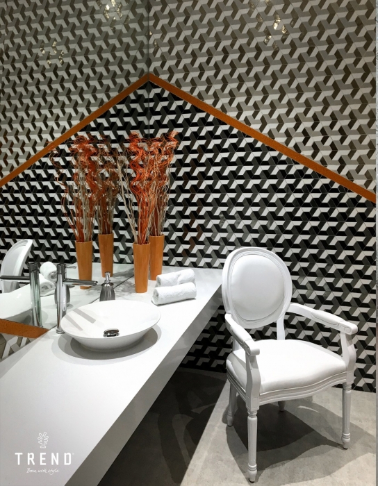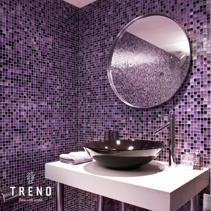 Мозаика итальянской фабрики Trend – это смальта, агломераты из гранул стекла, кварца и гранита. Используя красоту и особенности этих материалов, дизайнеры создают целые картины и даже визуальные эффекты. Например, серия Karma – цветная полупрозрачная стеклянная мозаика с рельефной поверхностью с серебристой подложкой, создает эффект объемного пространства за счет переплетенных линий и необычных цветовых решений.