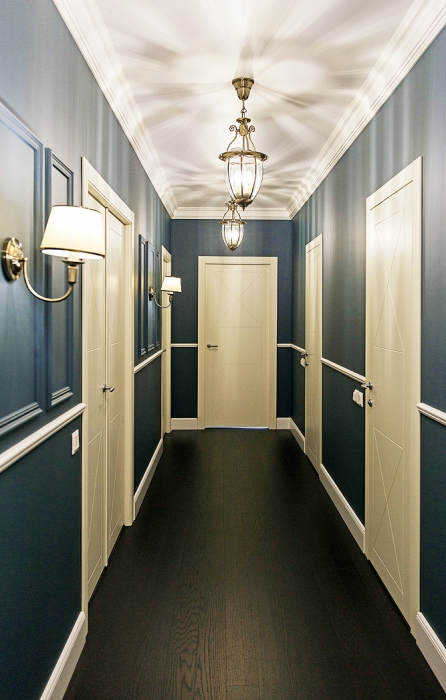 Выгодно оттеняет светлые стены паркетная доска насыщенного черно-коричневого цвета, с матовой текстурой Par-ky, заказанная у компании «Идея паркета» и использованная практически во всех помещениях квартиры. Такой прием позволяет стилистически «объединить» интерьер и все его зоны. Еще один элемент, повторяющийся в разных комнатах, – светильники. Лаконичные матовые белые и прозрачные стеклянные плафоны в обрамлении благородной латуни повторяются в плавных формах люстр гостиной и кухни, бра в ванной и спальне, светильников в коридоре. Все они, включая также и точечную подсветку, были куплены в компании «Стили света».