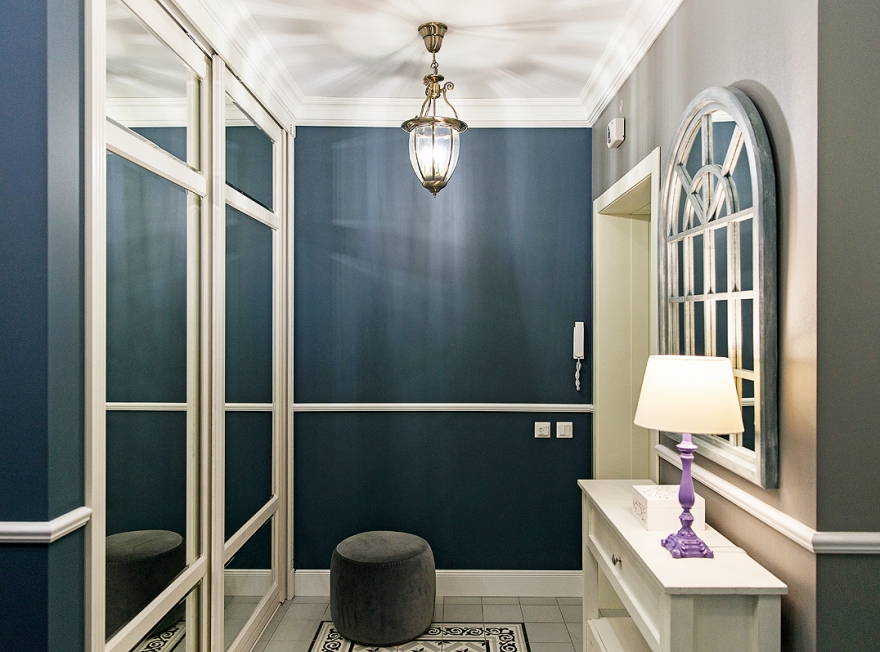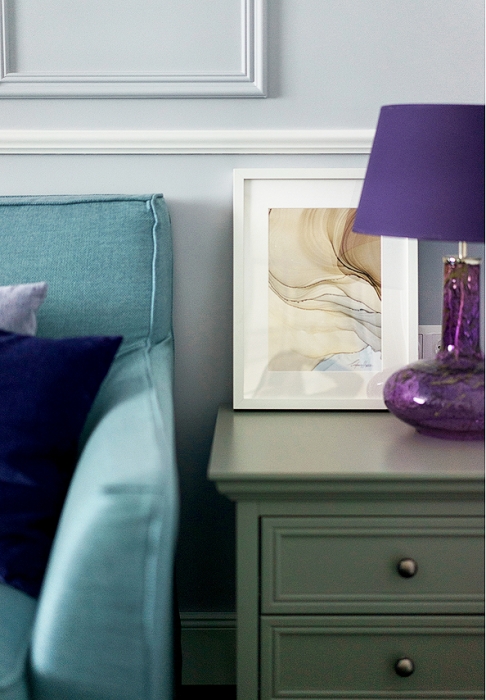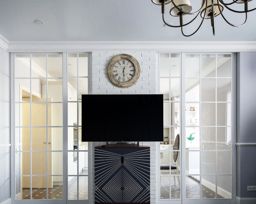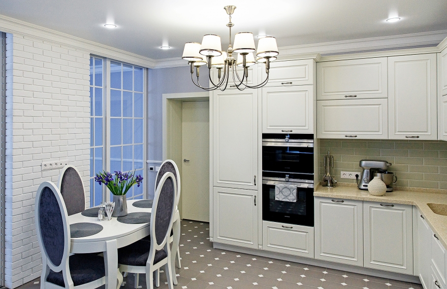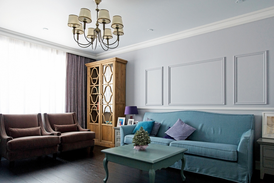 Интерьер выдержан в нео-классическом стиле, в котором мягкие пастельные оттенки комнат сочетаются с насыщенным глубоким цветом мебели и контрастным цветом холла. Кухню и гостиную объединили, но в то же время сохранили зонирование. Для этого возвели декоративную стену из белого кирпича и дополнили ее витражной стеклянной перегородкой, которая полностью пропускает свет, но при необходимости может закрыть зону приготовления пищи от зоны гостиной. В компанию светлым стенам была выбрана белая кухня, созданная по эскизам авторов проекта, и такая же светлая столовая группа. Контрастная обивка ее стульев удачно гармонирует с бирюзовым диваном, лавандовыми подушками и холодным сине-зеленым цветом журнального столика в гостиной. При всей уютности и мягкости пространства, высокий плинтус и тонкие лепные молдинги на стенах гостиной придают интерьеру парадный вид.