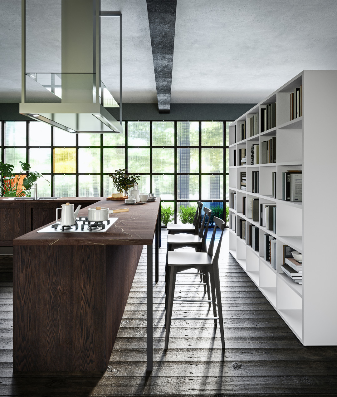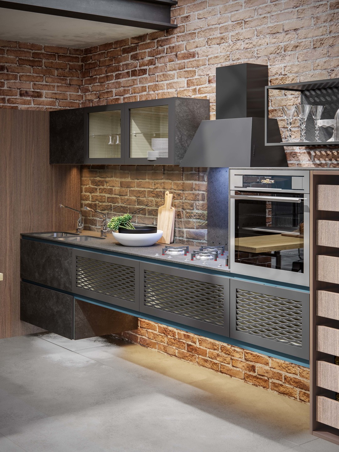 Металл. В тренде – белый металл, сталь, латунь, бронза и их имитация, металл с патиной, окисленный или черный. В коллекции «Марии» самое яркое воплощение этой модной тенденции заложено в модели Antro. Фасады из алюминиевой рамы с грубой перфорацией создают особенный брутальный образ. Его дополняют металлические накладные боковины на древесных или каменных фасадах, стеллажи и полки, опора столешницы и каминная вытяжка. Недавно фабрика представила еще одну новинку в стиле лофт – модель Farm из роскошного массива с модельными ручками и накладками на фасады из черного металла.