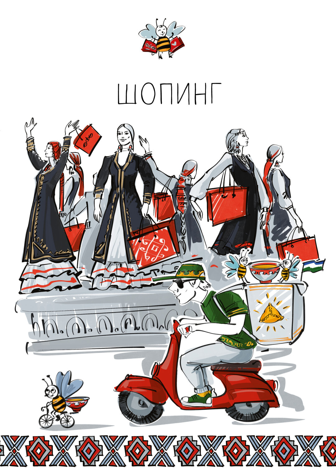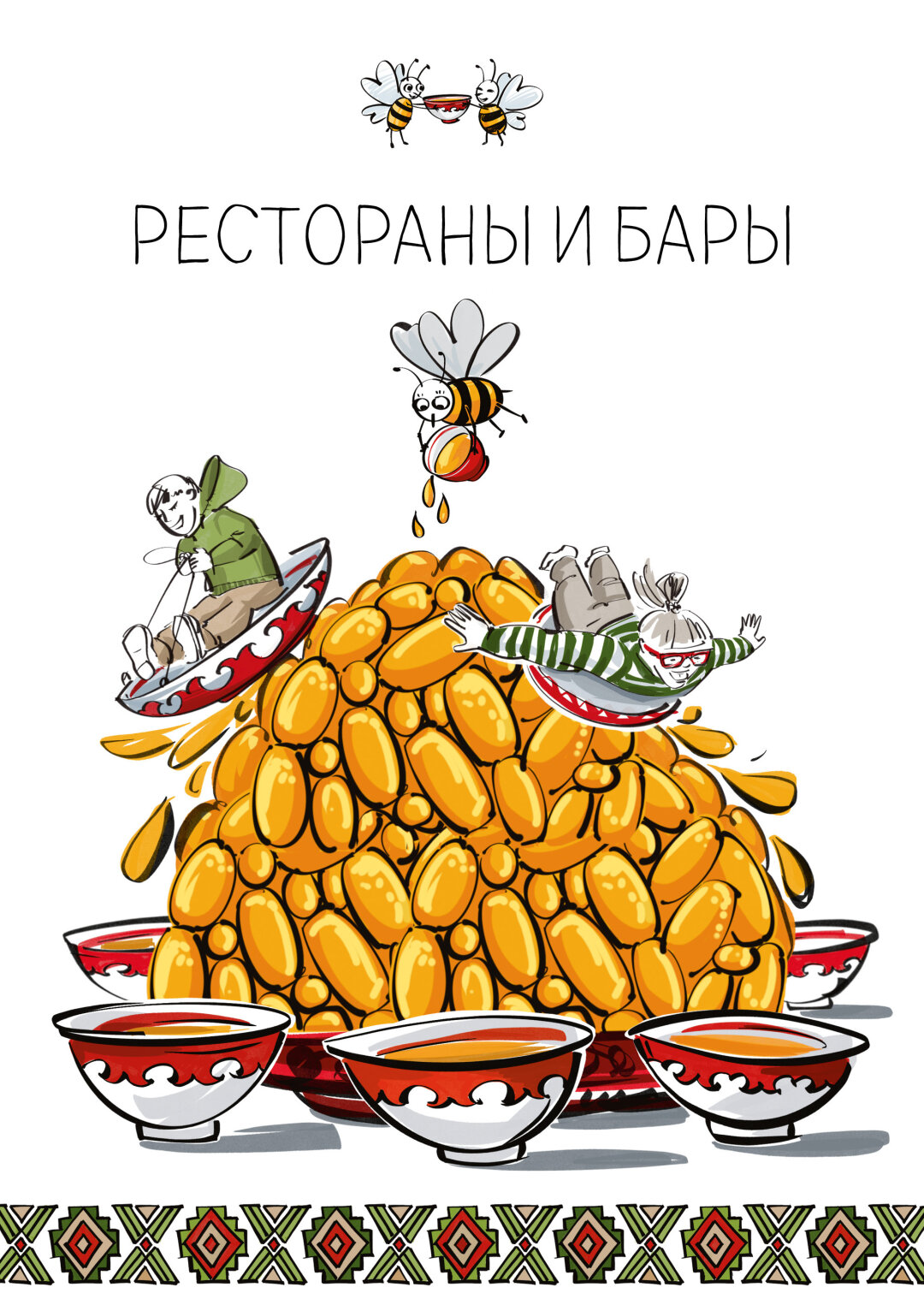 И у нас, как обычно, получилось не только удобно, но и очень красиво – каждый раздел открывают авторские иллюстрации художницы и друга редакции Лианы Нигаметзяновой. Именно она создала персонажей, которые прослеживаются во всех выпусках книги – гостеприимных пчел. Куница Да Винчи, Салават на карусели и учпочмаки в моей гавани – тоже дело ее рук.