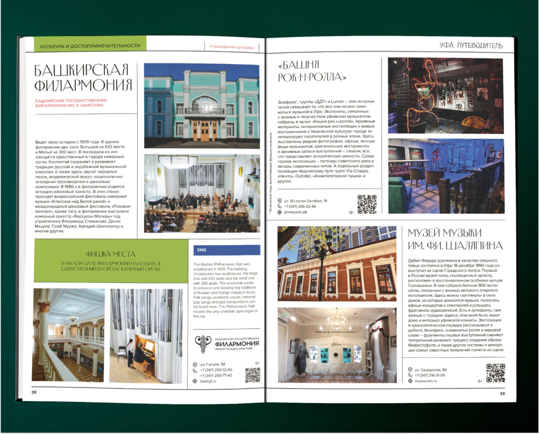 Мы сохранили удобную и понятную структуру: в путеводителе вы найдете отдельные тематические разделы, которые посвящены культурным местам, экскурсиям, бьюти-локациям и сувенирным магазинам. Сделали целую главу про республику: подробно рассказали про горы, заповедники и пещеры, которые стоит посетить.  Эксклюзивно для наших читателей известные уфимцы поделились своими любимыми местами в городе. Внутри найдете личные рекомендации Ильдара Абдразакова, Андрея Артемова, Ляйсан Утяшевой, группы Ay Yola – и не только.
