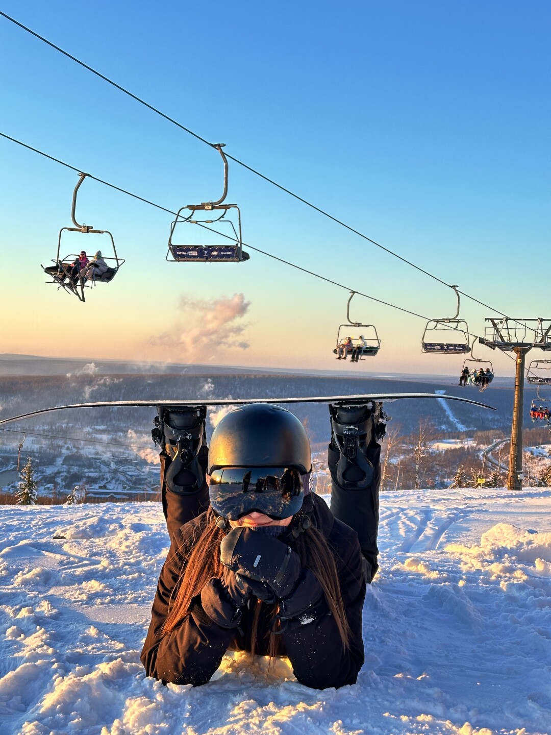 катается на сноуборде 7 лет, в этом году была на самой высокой точке Эльбруса