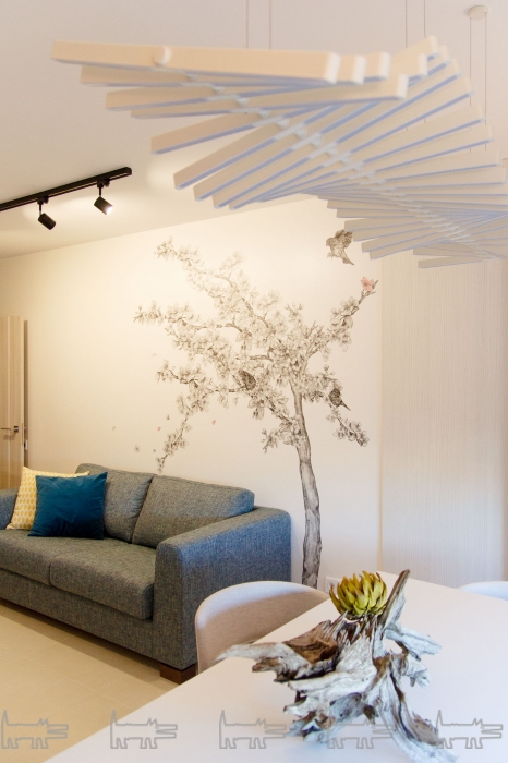 Центральное пространство квартиры – большая гостиная, дизайн которой стал отправной точкой для оформления остальных комнат. Поскольку пожелания хозяев дома изначально были довольно противоречивыми: мужчина хотел современности и даже некоторой дерзости, а женщина – уюта и теплоты, то и проект получился неординарным. Все требования смог совместить такой стиль, как софт-минимализм: достаточно лаконичный и строгий, он все же не выглядит холодным за счет сочетания мягких фактур, природных цветов и естественного света.