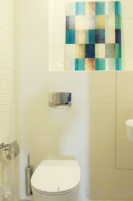 В квартире два санузла: небольшой гостевой и хозяйский, состоящий из двух отдельных помещений, в которых удалось разместить и ванну, и душевой уголок. Для отделки большой ванной комнаты использована плитка Gardenia Orchidea Linear, малой – плитка Piemme Valentino Satin, все – из салона плитки и сантехники «Альфа Керамик». Там же удалось подобрать всю сантехнику, смесители и мебель, отвечающую современным требованиям интерьерной моды.