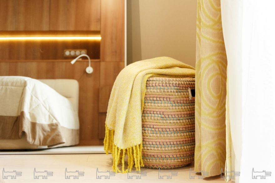 Оконный текстиль подбирался с учетом функций помещения: в гостиной и родительской спальне – классические портьеры с использованием нескольких видов ткани и цветовыми акцентами, в детской и столовой – более практичные и лаконичные римские шторы. Основное место в спальне, конечно же, занимает кровать. Модель «Астория» от Estetica достаточно высокая и большая, располагает ящиком для хранения белья, ее особенность – невысокий мягкий подголовник, на который удобно опереться при просмотре телевизора или чтении.