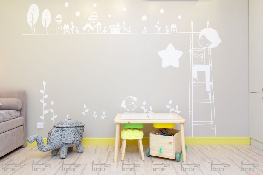 Детская, которая предназначается для обоих детей, намеренно не имеет отсылок к возрасту и полу ребенка – здесь есть и рабочее место для школьника, и пространство для игр малыша. Кровать-трансформер «Флай» от Estetica оборудована выдвижными ящиками для хранения белья или игрушек и безопасной мягкой спинкой. Для оформления комнаты – этот же прием, кстати, использован и в столовой – использованы обои-панно Mr. Perswall из салона Ambiente Decor.