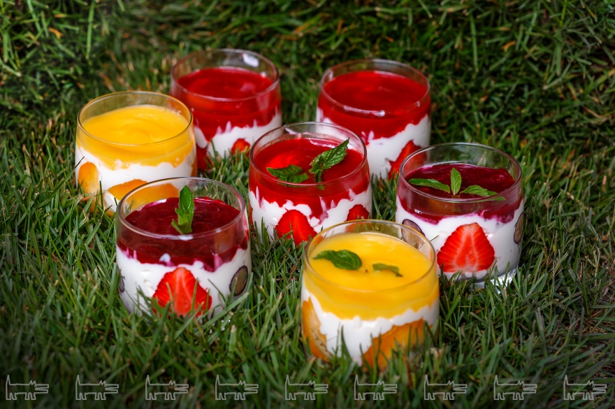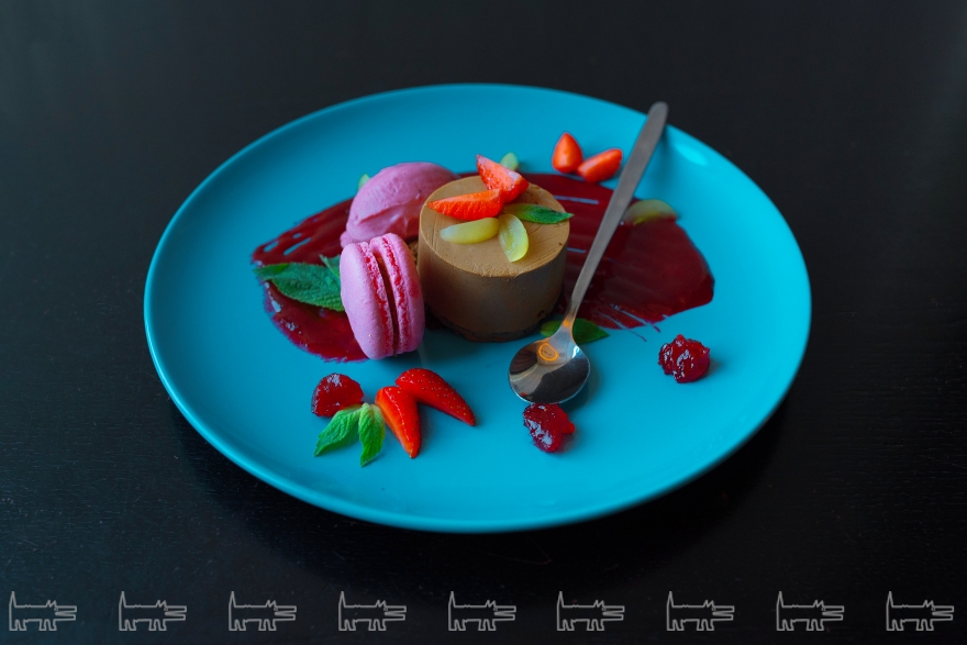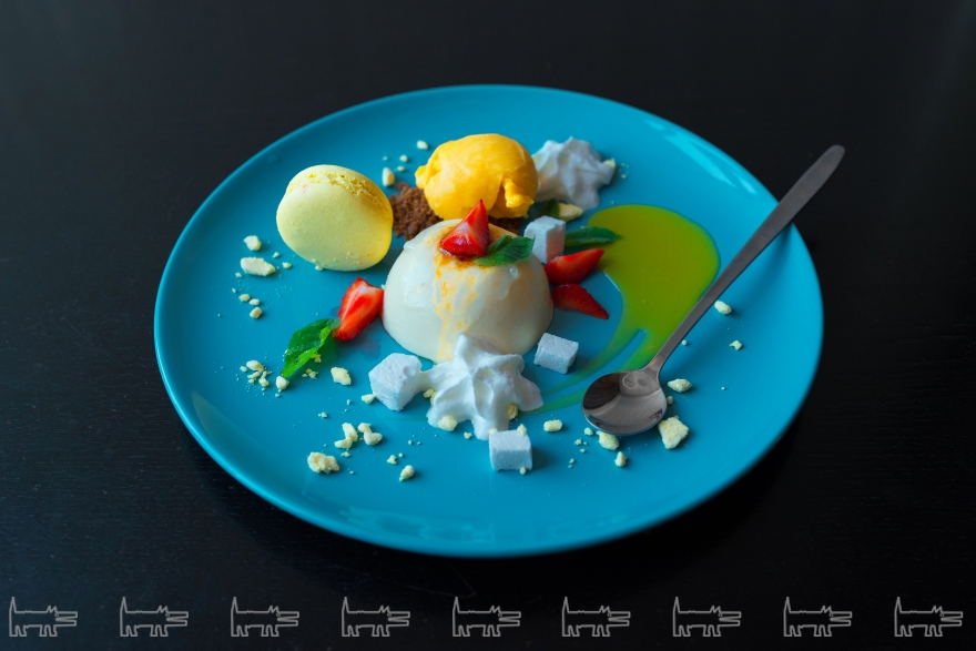 Натуральное малиновое мороженое собственного производства подается с «Трюфельным» пирожным, вишневым соусом, шоколадным макаронсом, свежими ягодами, а манго-маракуйя – с панна-коттой и муссом из сливочного пломбира.