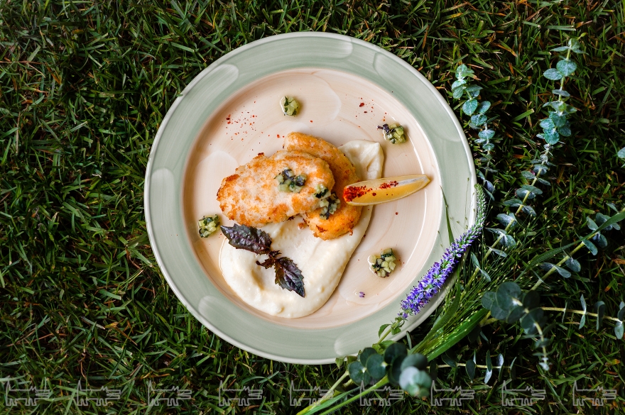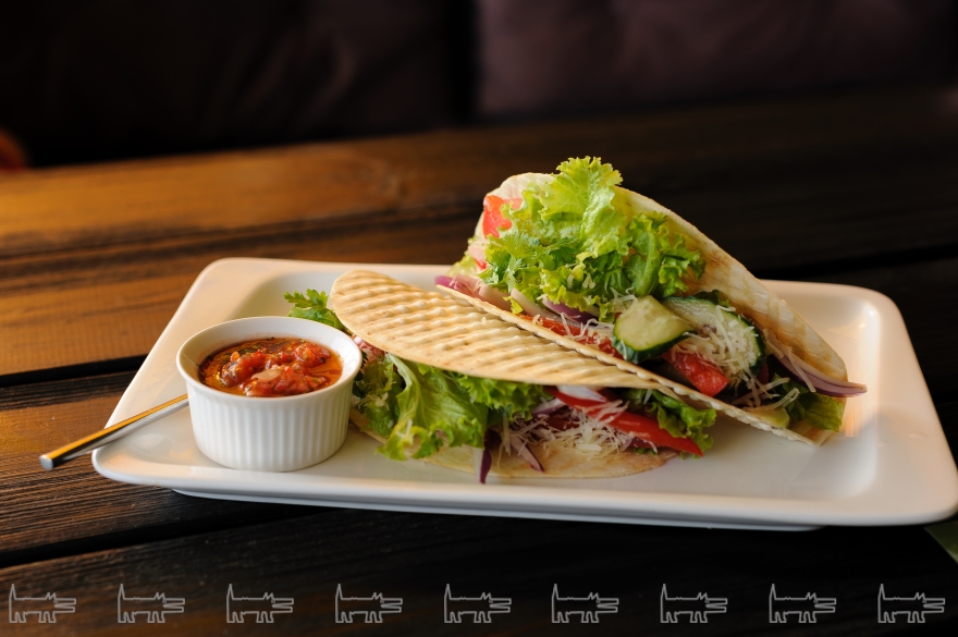 Филе морского окуня обжаривается на гриле с малым количеством масла, а после запекается в пароконвектомате и панируется с пюре из брокколи. Перед подачей добавляют немного овощей и зелени и заливают все грибным соусом. Основа такос – кукурузная лепешка, в которую кладут помидоры, лук и болгарский перец.