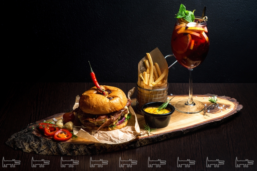 Сначала охлажденные вакуумированые куски мраморной говядины Black Angus превращаются в фарш, к которому добавляются соль и перец. Потом из фарша делают котлеты, которые ложатся на булочку, приготовленную в ночь перед открытием гастропаба. Чтобы получился бургер, остается добавить маринованные огурцы, розовые помидоры и ялтинский красный лук. Последний штрих – соус Чеддер в горячем виде.