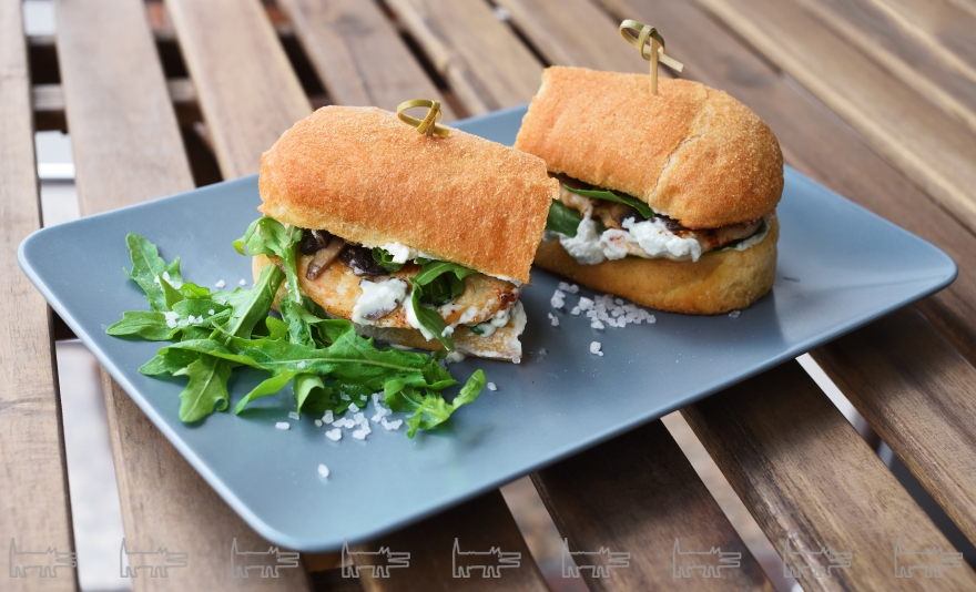 Куриное филе маринуется в паприке и обжаривается на оливковом масле. Свежие шампиньоны тоже обжариваются и вместе с филе и подушкой из рукколы укладываются сверху на свежеиспеченный панини, разрезанный вдоль и обильно политый соусом, сваренным из сливок и оригинального немецкого сыра с голубой плесенью.